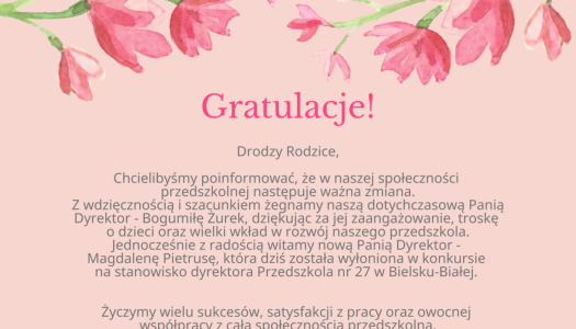 Drodzy Rodzice, Chcielibyśmy poinformować, że w naszej społeczności przedszkolnej następuje ważna zmiana. Z wdzięcznością i szacunkiem żegn...