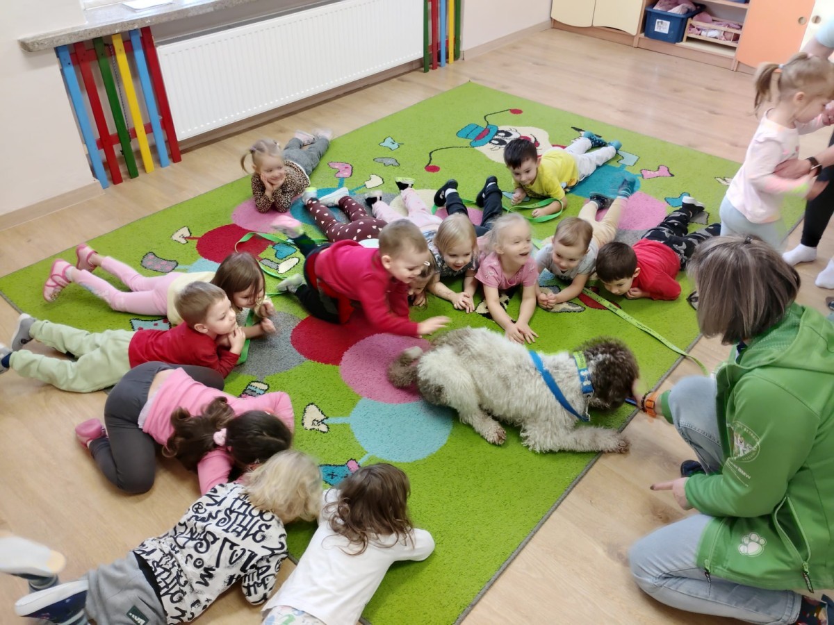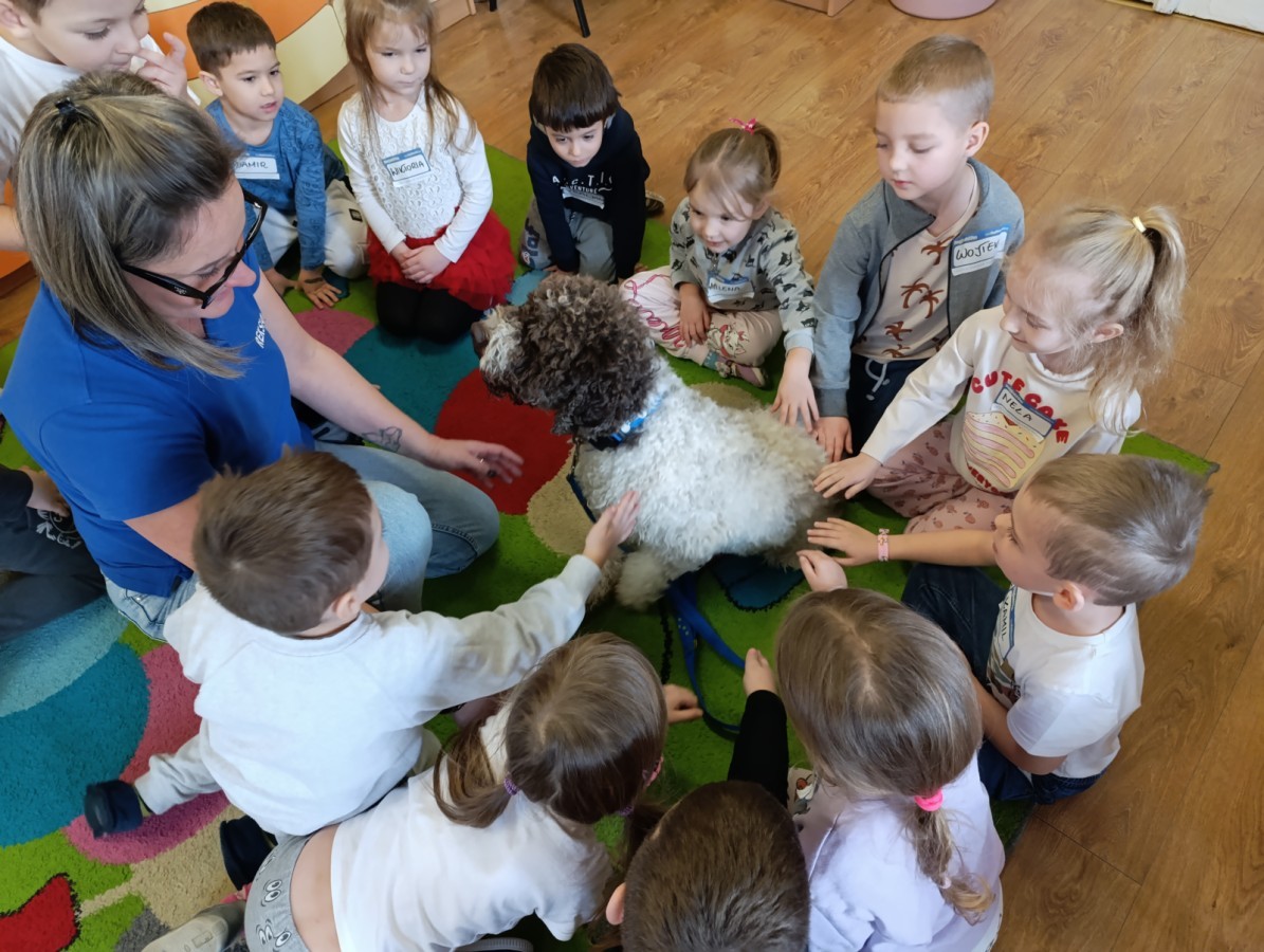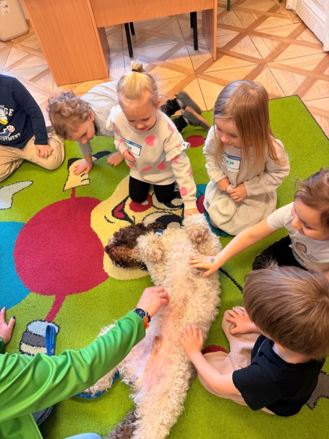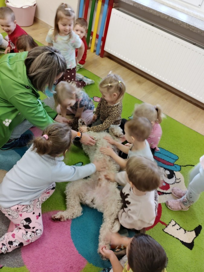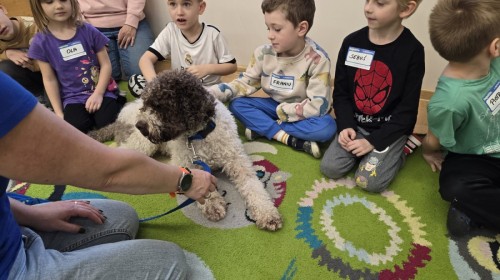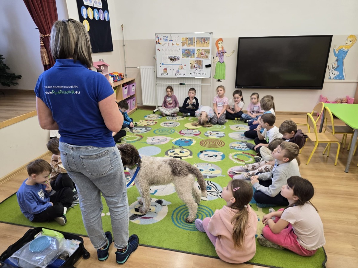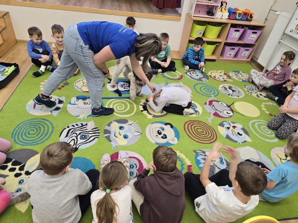 W czwartek, w naszym przedszkolu odbyły się zajęcia z dogoterapii. Była to wyjątkowa forma zajęć, podczas której dzieci miały możliwość bezpośredniego kontaktu z przyjaznym, odpowiednio wyszkolonym psem-terapeutą. Spotkanie było prowadzone przez certyfikowanego dogoterapeutę i odbywało się w bezpiecznej, spokojnej atmosferze, sprzyjającej nauce oraz budowaniu pozytywnych emocji. Podczas zajęć przedszkolaki poznały zasady właściwego zachowania w kontakcie ze zwierzęciem, nauczyły się odczytywać jego sygnały i wiedzą już jak zadbać o jego komfort. Wspólnie z terapeutą uczestniczyły również w różnorodnych aktywnościach: m.in. głaskaniu i karmieniu psa. Zajęcia działały na dzieci uspokajająco i motywująco, pomagały budować poczucie bezpieczeństwa oraz wzmacniały pewność siebie. Wspierały ponadto rozwój emocjonalny, społeczny i ruchowy, uczyły empatii oraz odpowiedzialności i szacunku do zwierząt. Cały dzień minął we wspaniałej, edukacyjnej atmosferze.