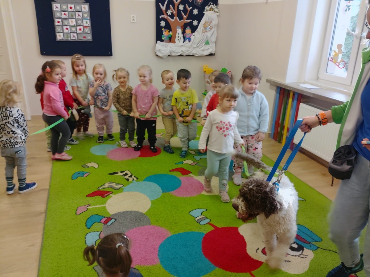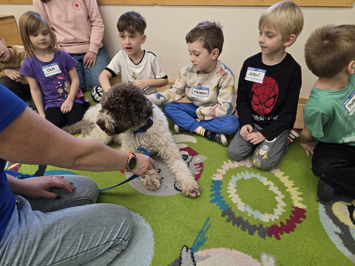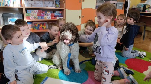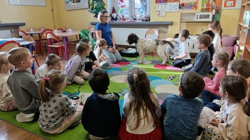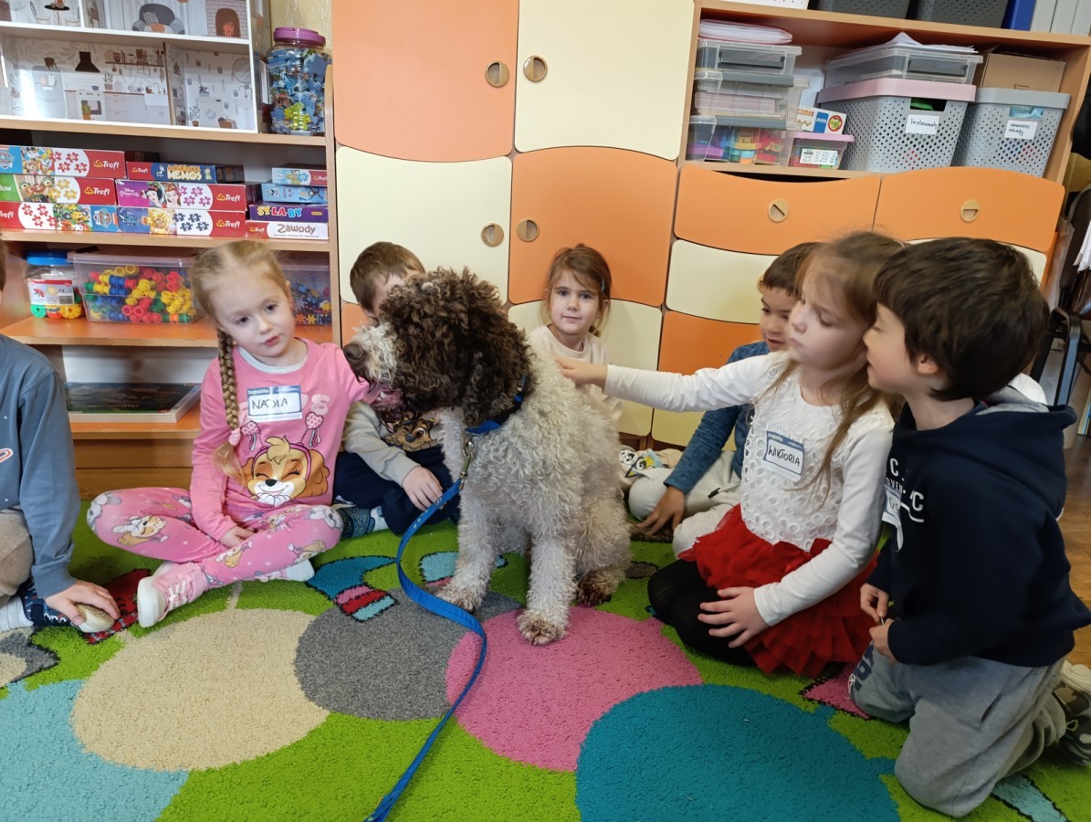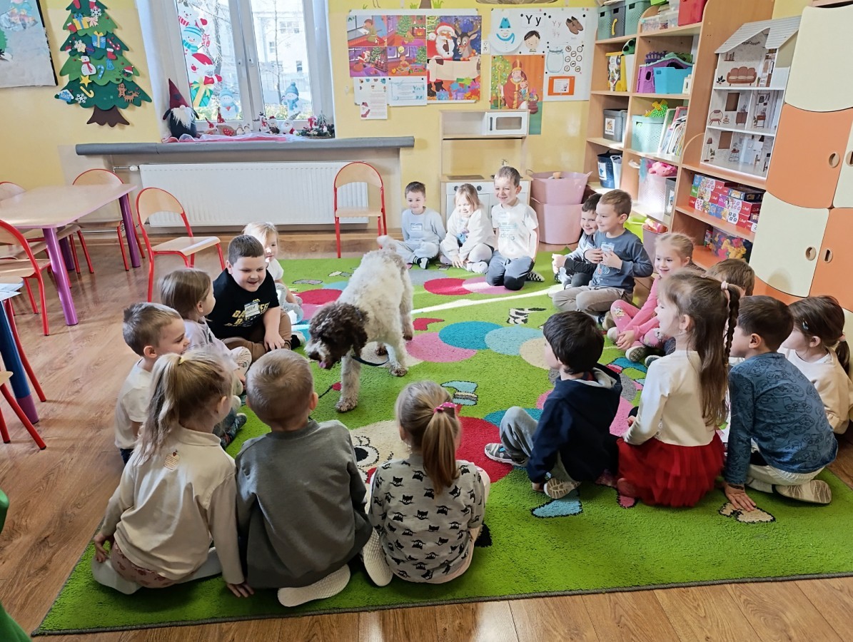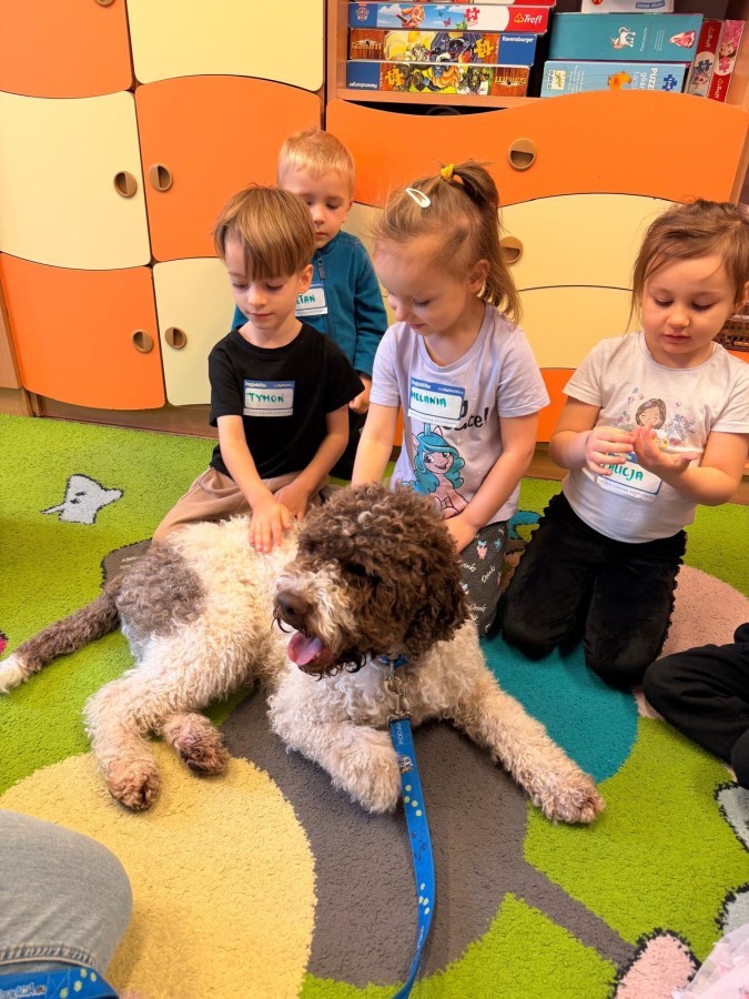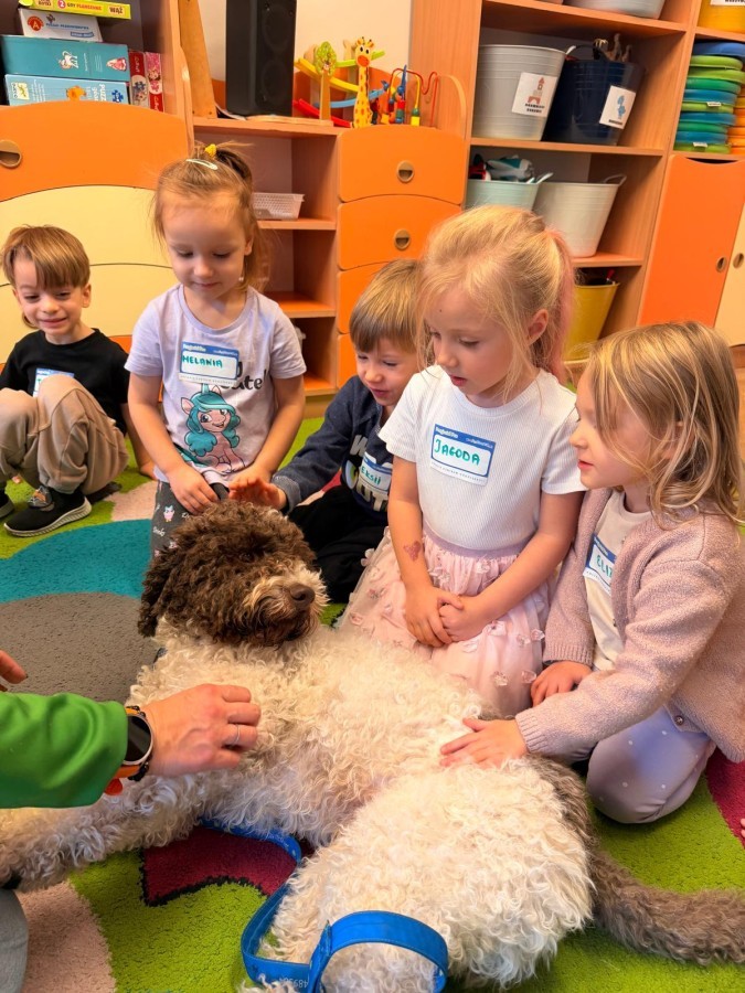 W czwartek, w naszym przedszkolu odbyły się zajęcia z dogoterapii. Była to wyjątkowa forma zajęć, podczas której dzieci miały możliwość bezpośredniego kontaktu z przyjaznym, odpowiednio wyszkolonym psem-terapeutą. Spotkanie było prowadzone przez certyfikowanego dogoterapeutę i odbywało się w bezpiecznej, spokojnej atmosferze, sprzyjającej nauce oraz budowaniu pozytywnych emocji. Podczas zajęć przedszkolaki poznały zasady właściwego zachowania w kontakcie ze zwierzęciem, nauczyły się odczytywać jego sygnały i wiedzą już jak zadbać o jego komfort. Wspólnie z terapeutą uczestniczyły również w różnorodnych aktywnościach: m.in. głaskaniu i karmieniu psa. Zajęcia działały na dzieci uspokajająco i motywująco, pomagały budować poczucie bezpieczeństwa oraz wzmacniały pewność siebie. Wspierały ponadto rozwój emocjonalny, społeczny i ruchowy, uczyły empatii oraz odpowiedzialności i szacunku do zwierząt. Cały dzień minął we wspaniałej, edukacyjnej atmosferze.
