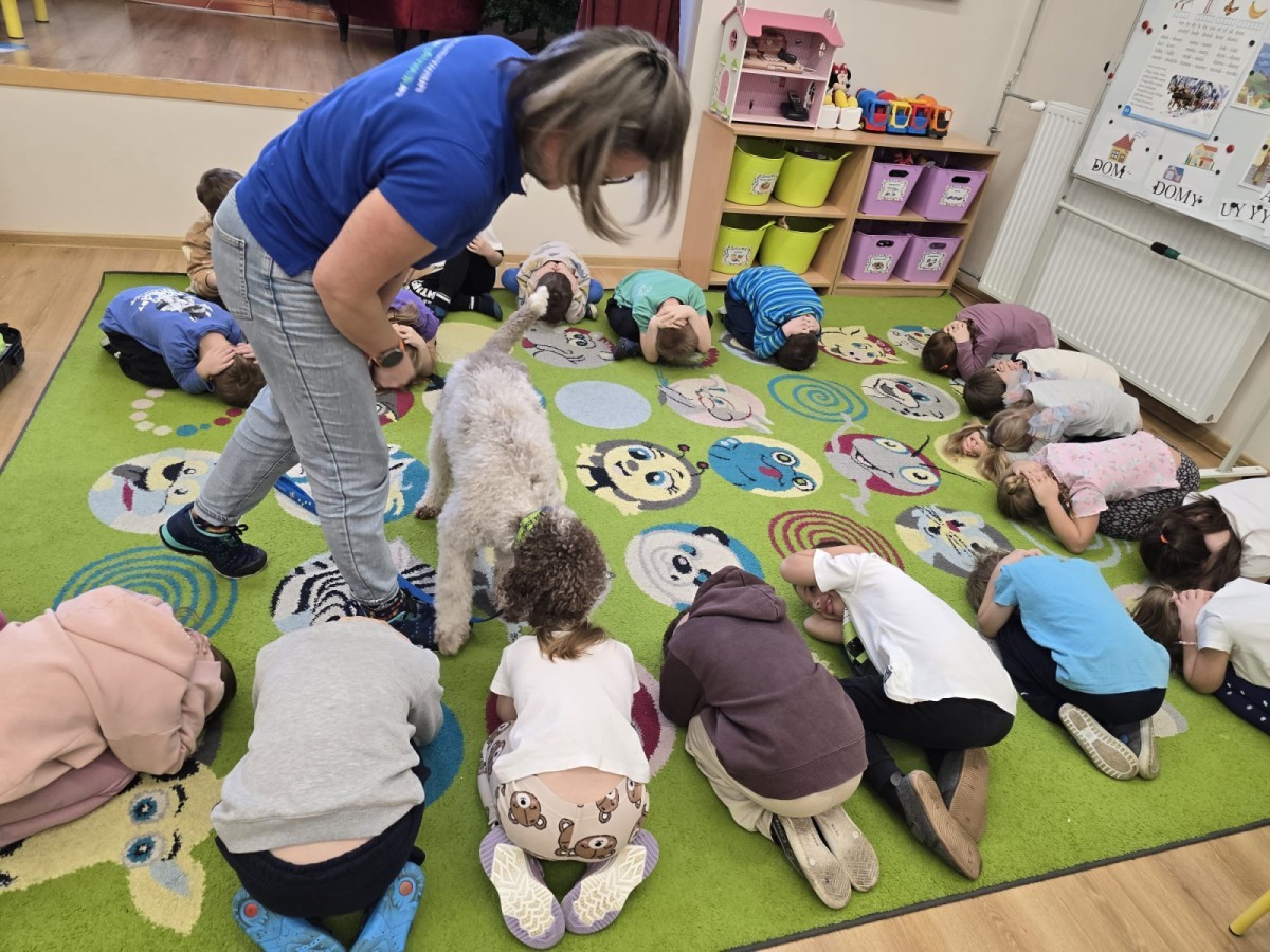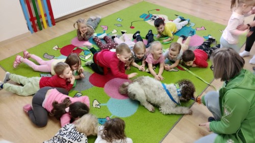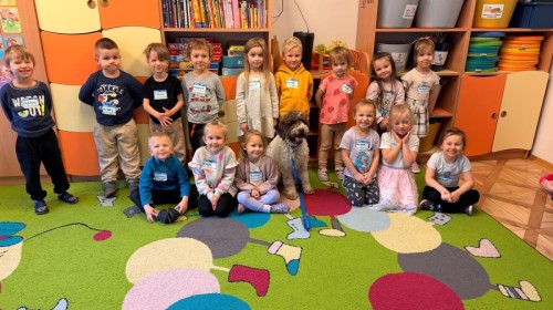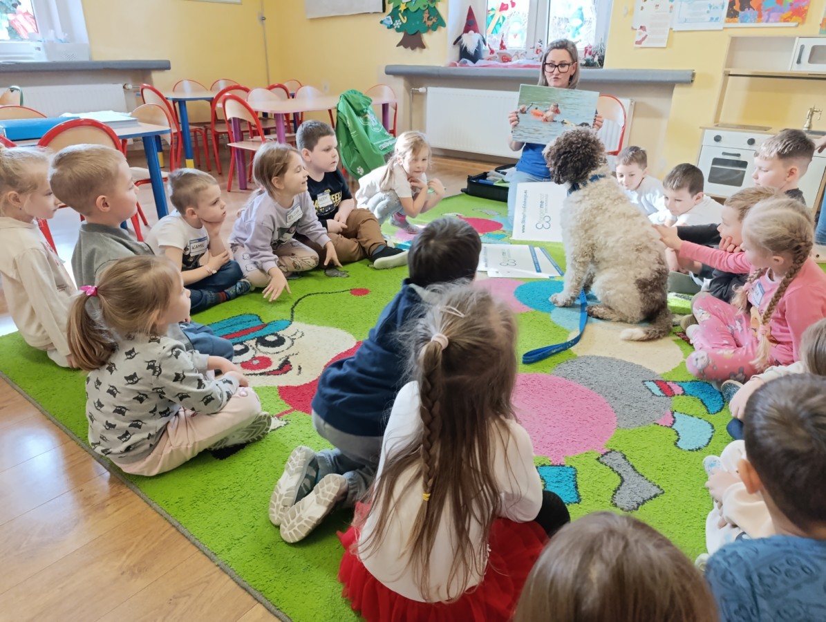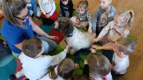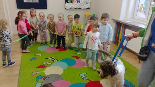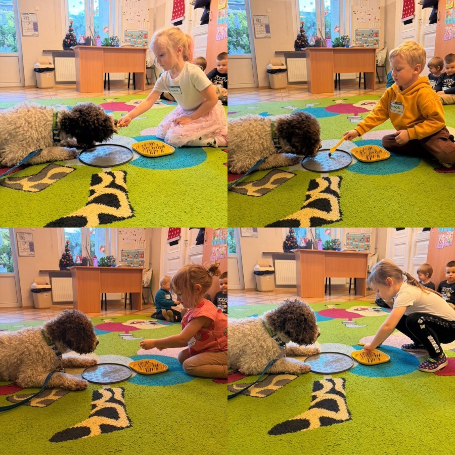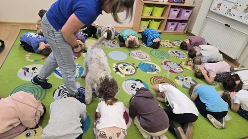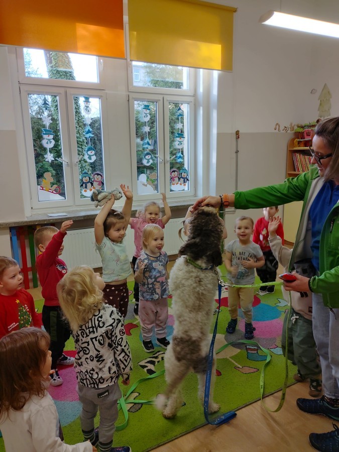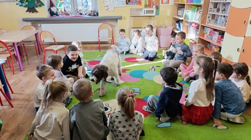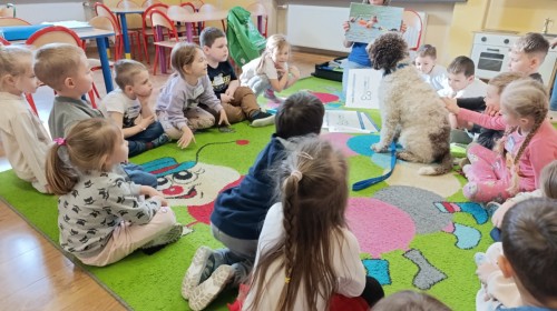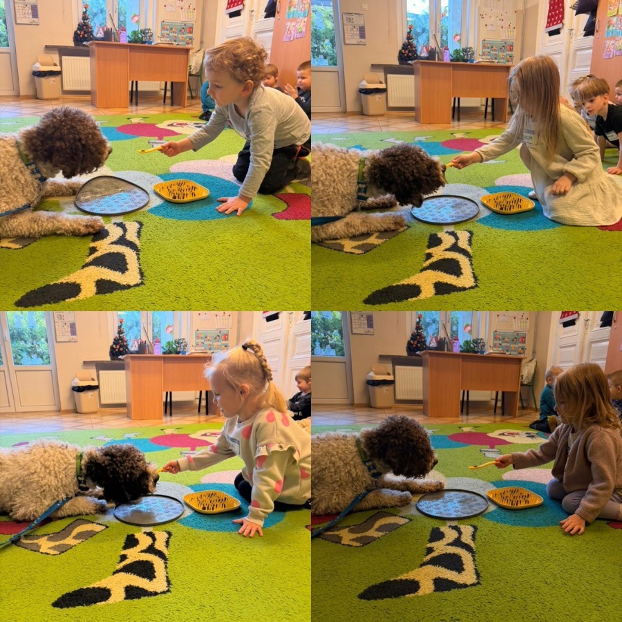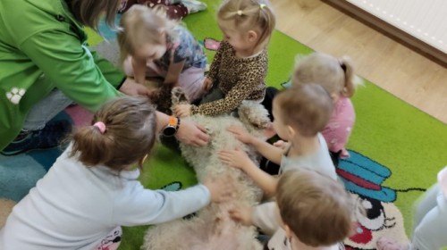 W czwartek, w naszym przedszkolu odbyły się zajęcia z dogoterapii. Była to wyjątkowa forma zajęć, podczas której dzieci miały możliwość bezpośredniego kontaktu z przyjaznym, odpowiednio wyszkolonym psem-terapeutą. Spotkanie było prowadzone przez certyfikowanego dogoterapeutę i odbywało się w bezpiecznej, spokojnej atmosferze, sprzyjającej nauce oraz budowaniu pozytywnych emocji. Podczas zajęć przedszkolaki poznały zasady właściwego zachowania w kontakcie ze zwierzęciem, nauczyły się odczytywać jego sygnały i wiedzą już jak zadbać o jego komfort. Wspólnie z terapeutą uczestniczyły również w różnorodnych aktywnościach: m.in. głaskaniu i karmieniu psa. Zajęcia działały na dzieci uspokajająco i motywująco, pomagały budować poczucie bezpieczeństwa oraz wzmacniały pewność siebie. Wspierały ponadto rozwój emocjonalny, społeczny i ruchowy, uczyły empatii oraz odpowiedzialności i szacunku do zwierząt. Cały dzień minął we wspaniałej, edukacyjnej atmosferze.