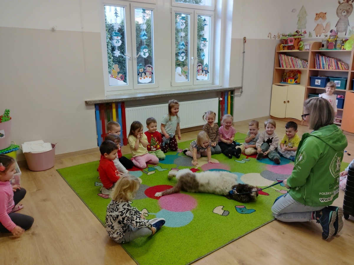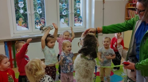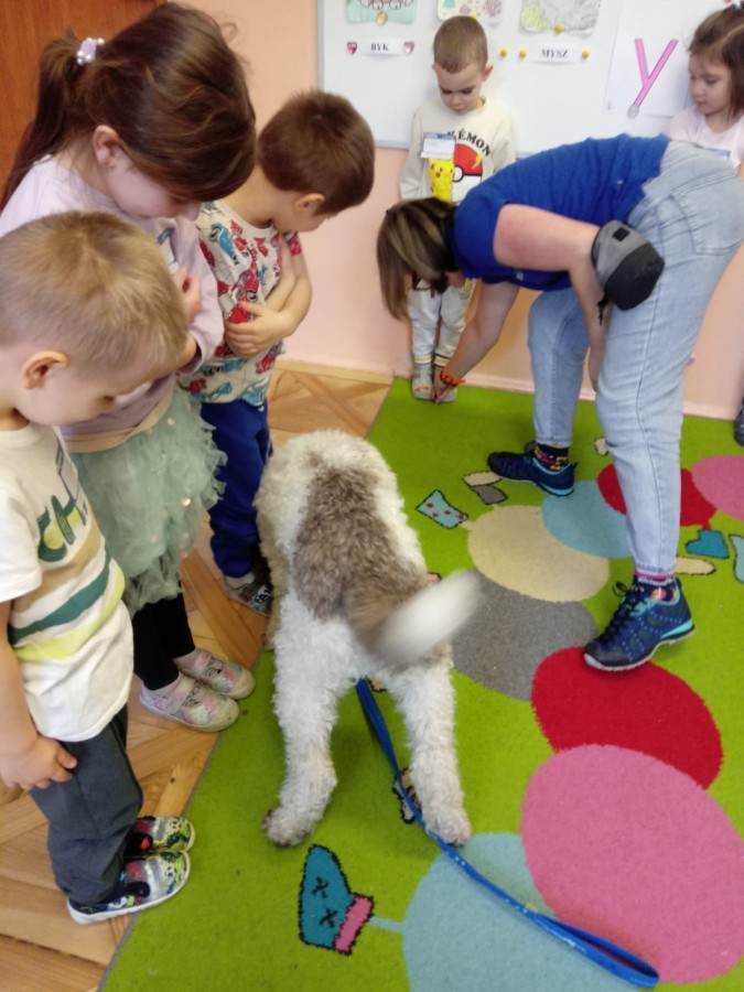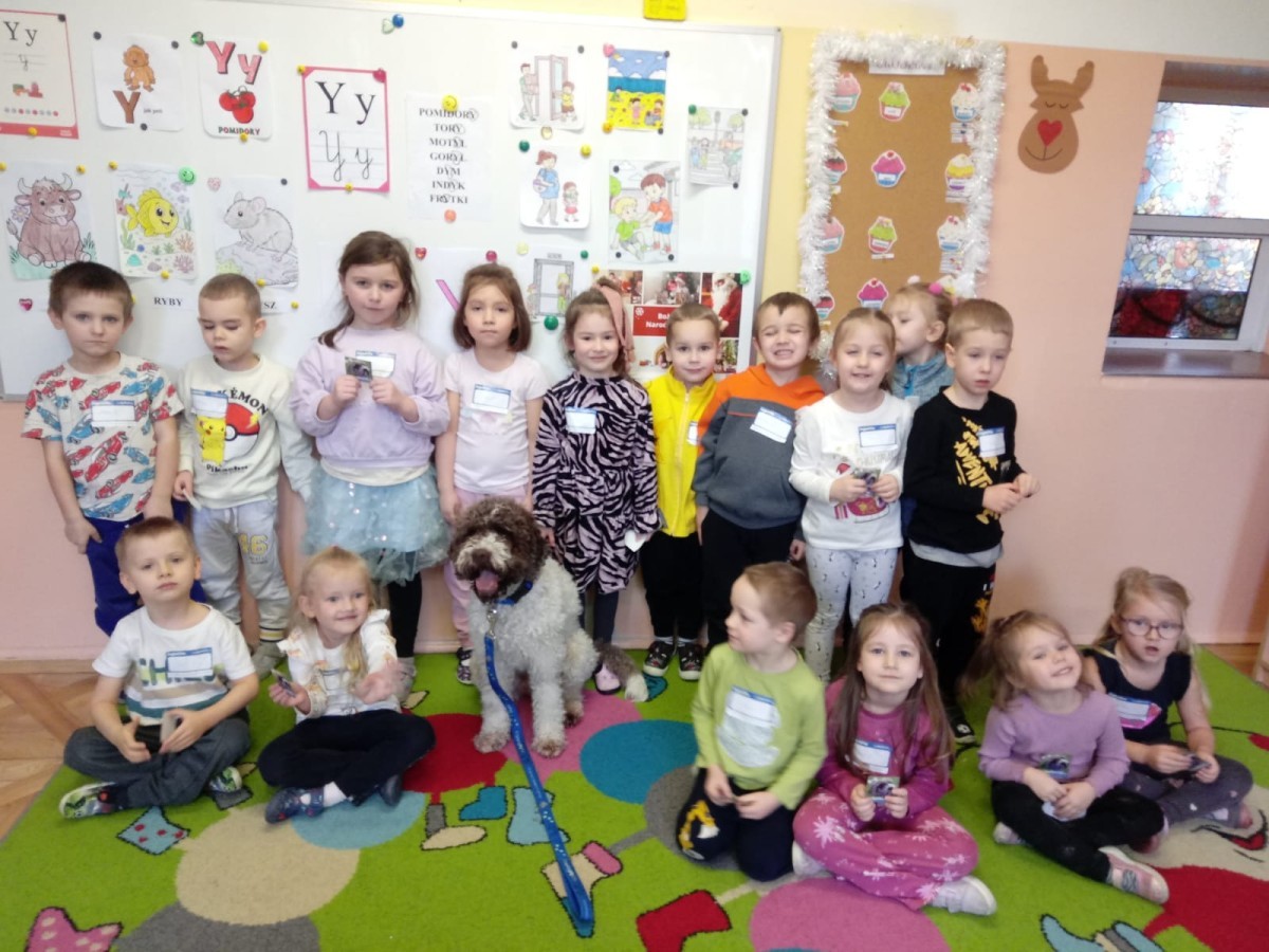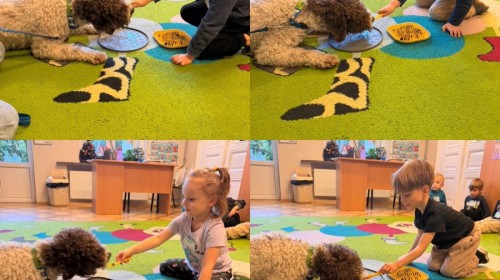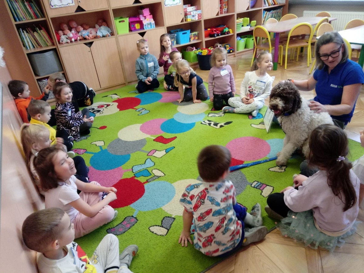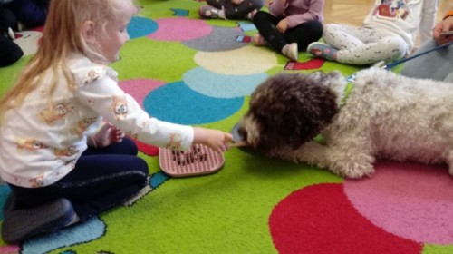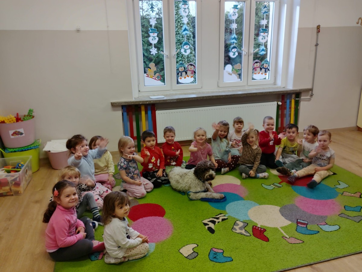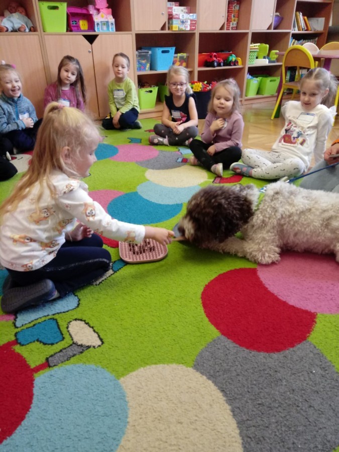 W czwartek, w naszym przedszkolu odbyły się zajęcia z dogoterapii. Była to wyjątkowa forma zajęć, podczas której dzieci miały możliwość bezpośredniego kontaktu z przyjaznym, odpowiednio wyszkolonym psem-terapeutą. Spotkanie było prowadzone przez certyfikowanego dogoterapeutę i odbywało się w bezpiecznej, spokojnej atmosferze, sprzyjającej nauce oraz budowaniu pozytywnych emocji. Podczas zajęć przedszkolaki poznały zasady właściwego zachowania w kontakcie ze zwierzęciem, nauczyły się odczytywać jego sygnały i wiedzą już jak zadbać o jego komfort. Wspólnie z terapeutą uczestniczyły również w różnorodnych aktywnościach: m.in. głaskaniu i karmieniu psa. Zajęcia działały na dzieci uspokajająco i motywująco, pomagały budować poczucie bezpieczeństwa oraz wzmacniały pewność siebie. Wspierały ponadto rozwój emocjonalny, społeczny i ruchowy, uczyły empatii oraz odpowiedzialności i szacunku do zwierząt. Cały dzień minął we wspaniałej, edukacyjnej atmosferze.