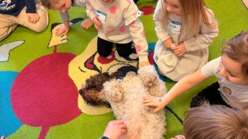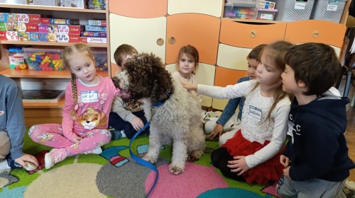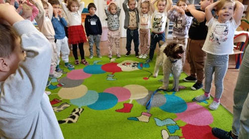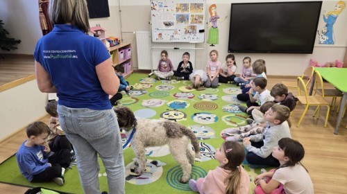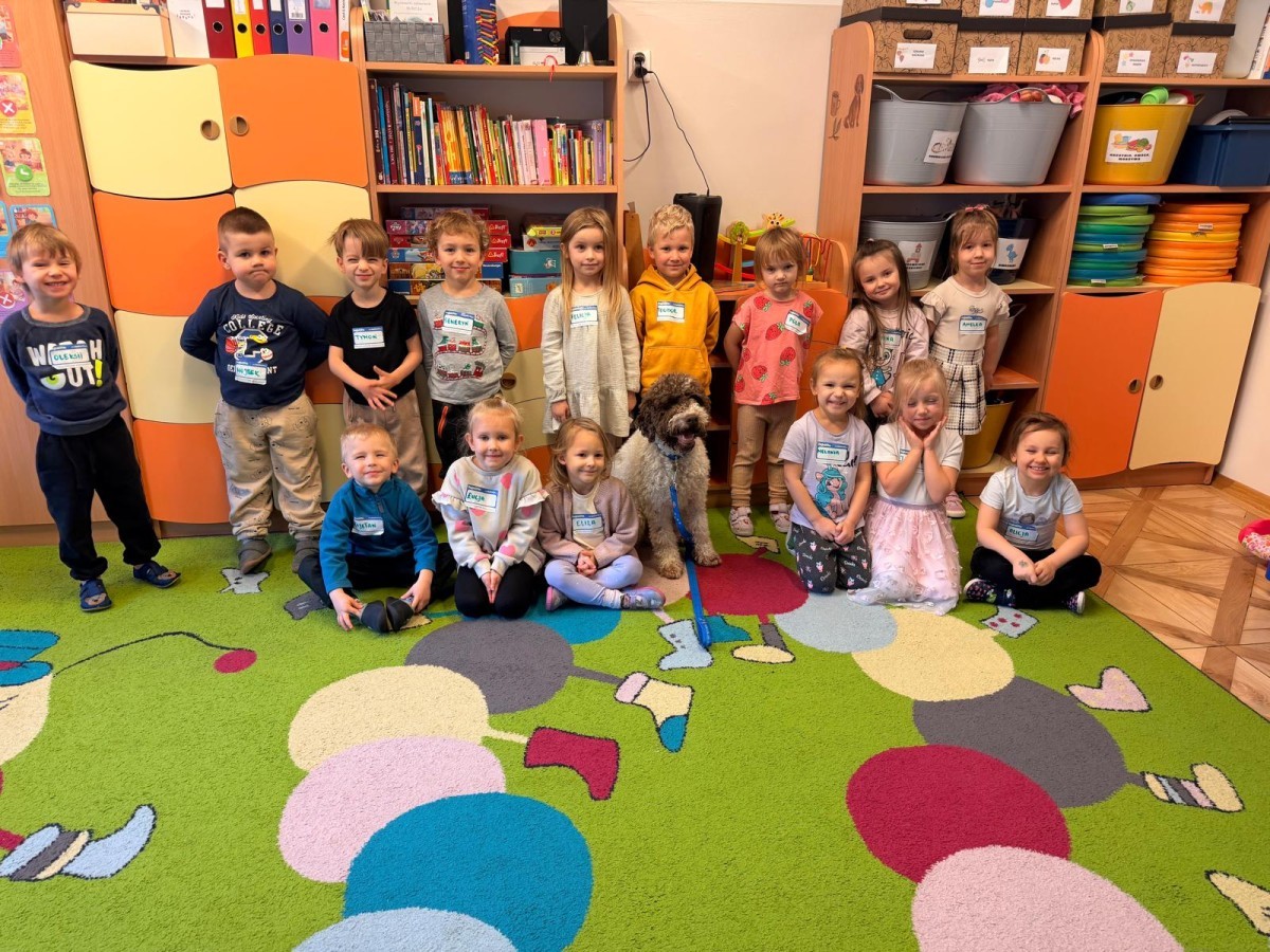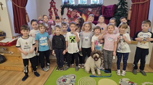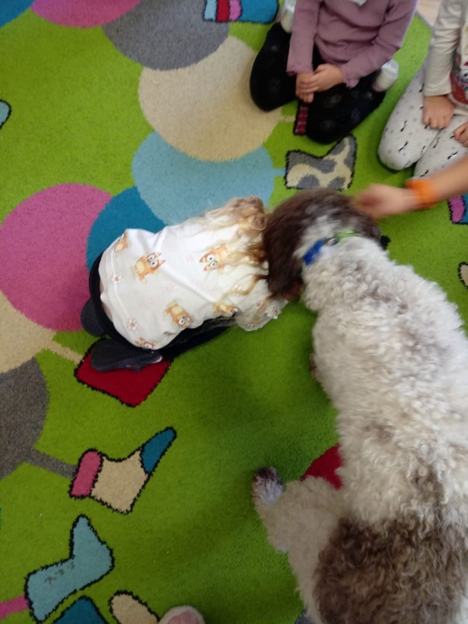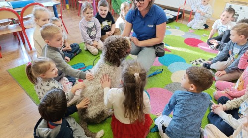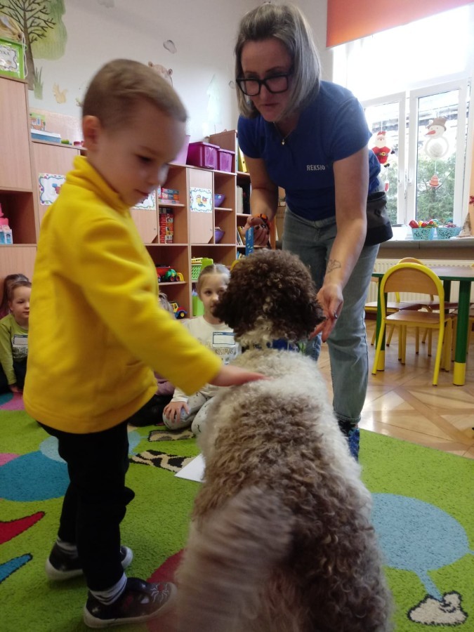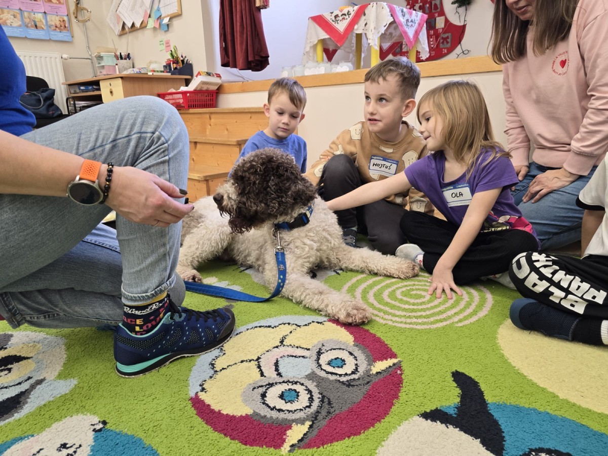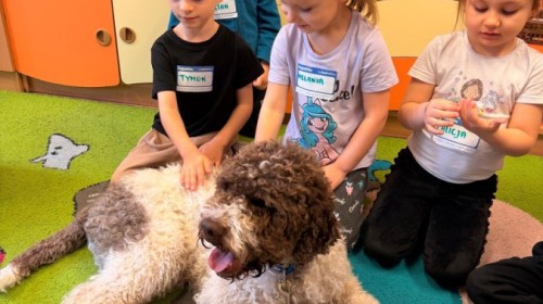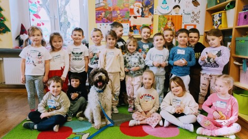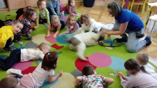 W czwartek, w naszym przedszkolu odbyły się zajęcia z dogoterapii. Była to wyjątkowa forma zajęć, podczas której dzieci miały możliwość bezpośredniego kontaktu z przyjaznym, odpowiednio wyszkolonym psem-terapeutą. Spotkanie było prowadzone przez certyfikowanego dogoterapeutę i odbywało się w bezpiecznej, spokojnej atmosferze, sprzyjającej nauce oraz budowaniu pozytywnych emocji. Podczas zajęć przedszkolaki poznały zasady właściwego zachowania w kontakcie ze zwierzęciem, nauczyły się odczytywać jego sygnały i wiedzą już jak zadbać o jego komfort. Wspólnie z terapeutą uczestniczyły również w różnorodnych aktywnościach: m.in. głaskaniu i karmieniu psa. Zajęcia działały na dzieci uspokajająco i motywująco, pomagały budować poczucie bezpieczeństwa oraz wzmacniały pewność siebie. Wspierały ponadto rozwój emocjonalny, społeczny i ruchowy, uczyły empatii oraz odpowiedzialności i szacunku do zwierząt. Cały dzień minął we wspaniałej, edukacyjnej atmosferze.
