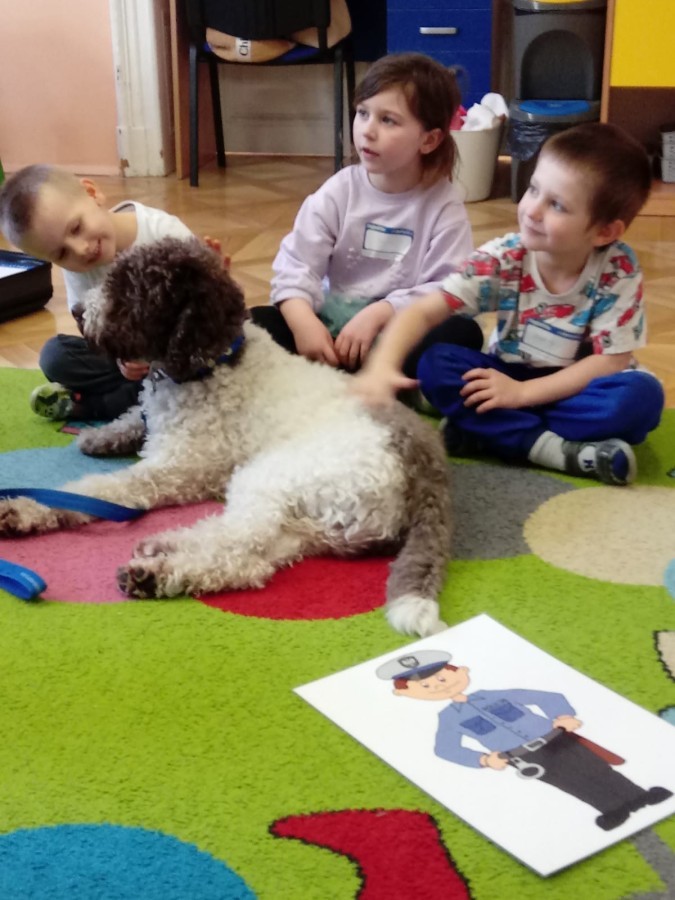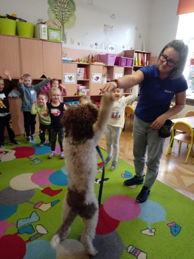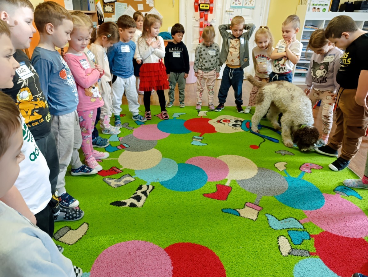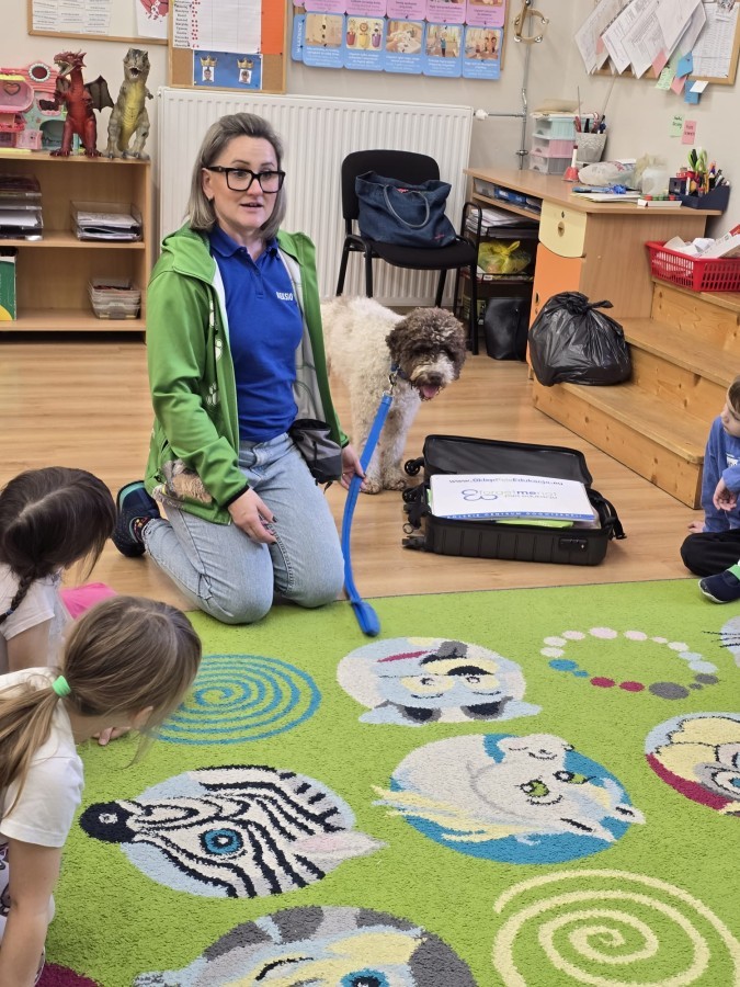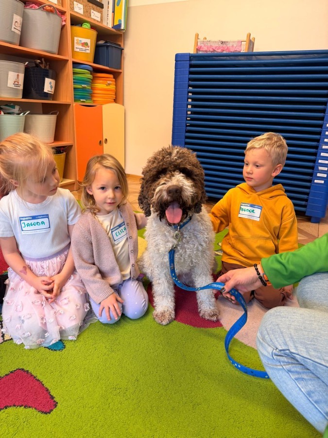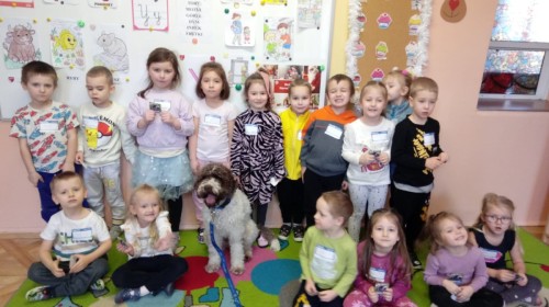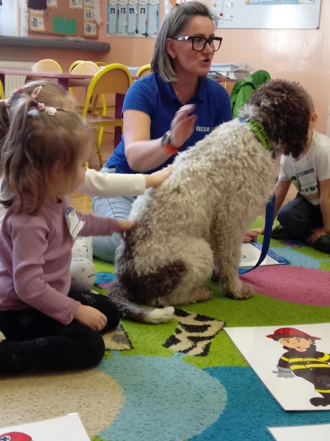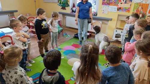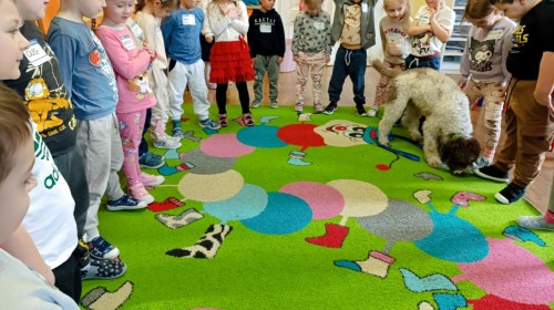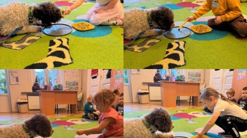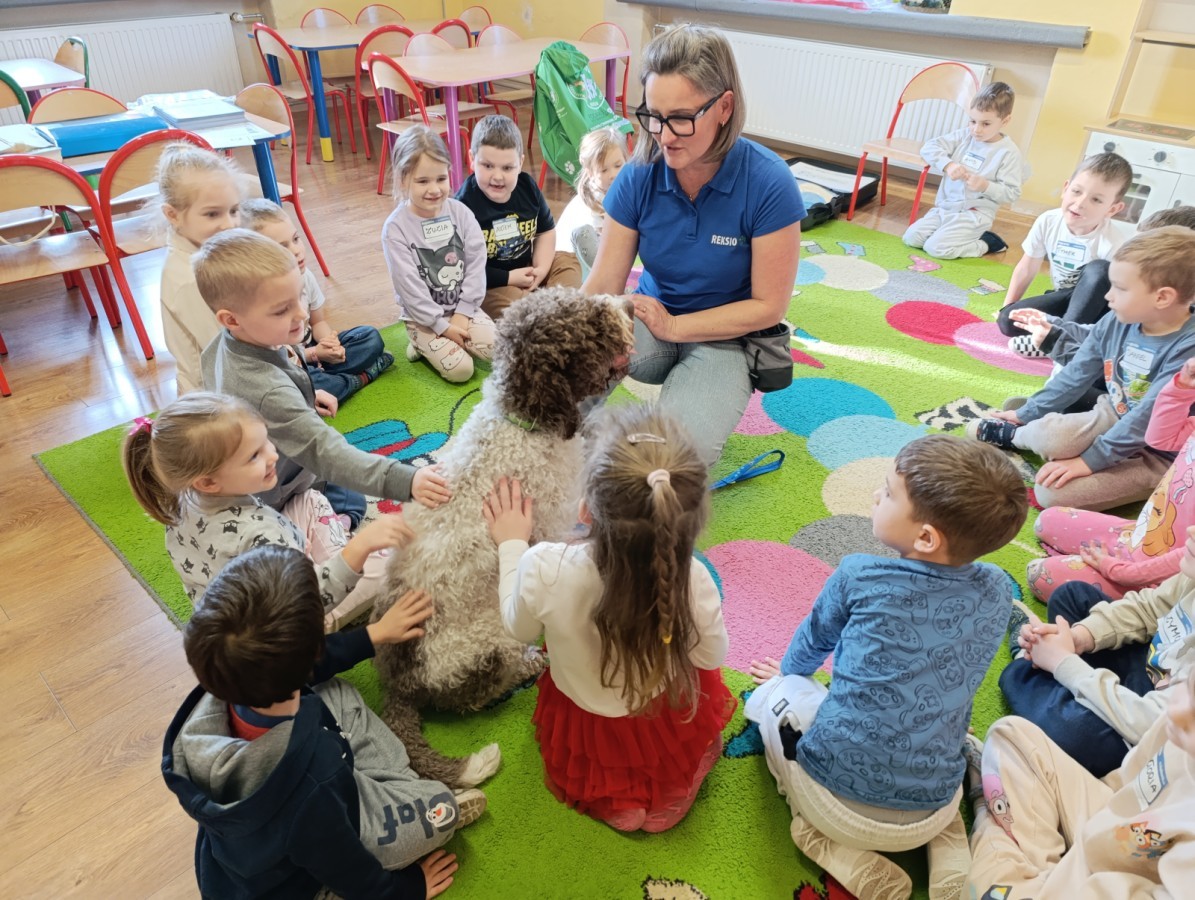 W czwartek, w naszym przedszkolu odbyły się zajęcia z dogoterapii. Była to wyjątkowa forma zajęć, podczas której dzieci miały możliwość bezpośredniego kontaktu z przyjaznym, odpowiednio wyszkolonym psem-terapeutą. Spotkanie było prowadzone przez certyfikowanego dogoterapeutę i odbywało się w bezpiecznej, spokojnej atmosferze, sprzyjającej nauce oraz budowaniu pozytywnych emocji. Podczas zajęć przedszkolaki poznały zasady właściwego zachowania w kontakcie ze zwierzęciem, nauczyły się odczytywać jego sygnały i wiedzą już jak zadbać o jego komfort. Wspólnie z terapeutą uczestniczyły również w różnorodnych aktywnościach: m.in. głaskaniu i karmieniu psa. Zajęcia działały na dzieci uspokajająco i motywująco, pomagały budować poczucie bezpieczeństwa oraz wzmacniały pewność siebie. Wspierały ponadto rozwój emocjonalny, społeczny i ruchowy, uczyły empatii oraz odpowiedzialności i szacunku do zwierząt. Cały dzień minął we wspaniałej, edukacyjnej atmosferze.
