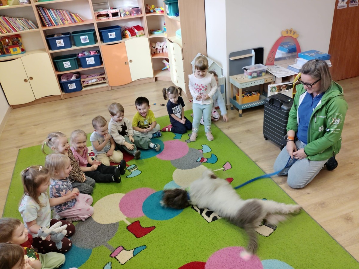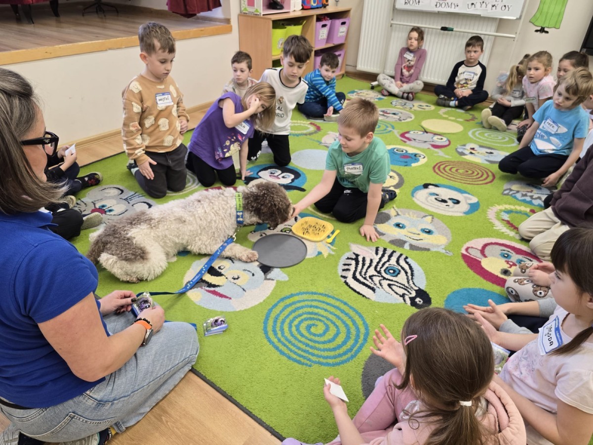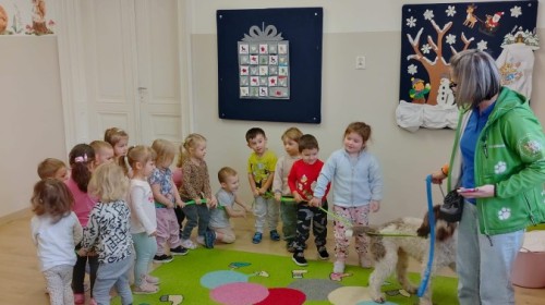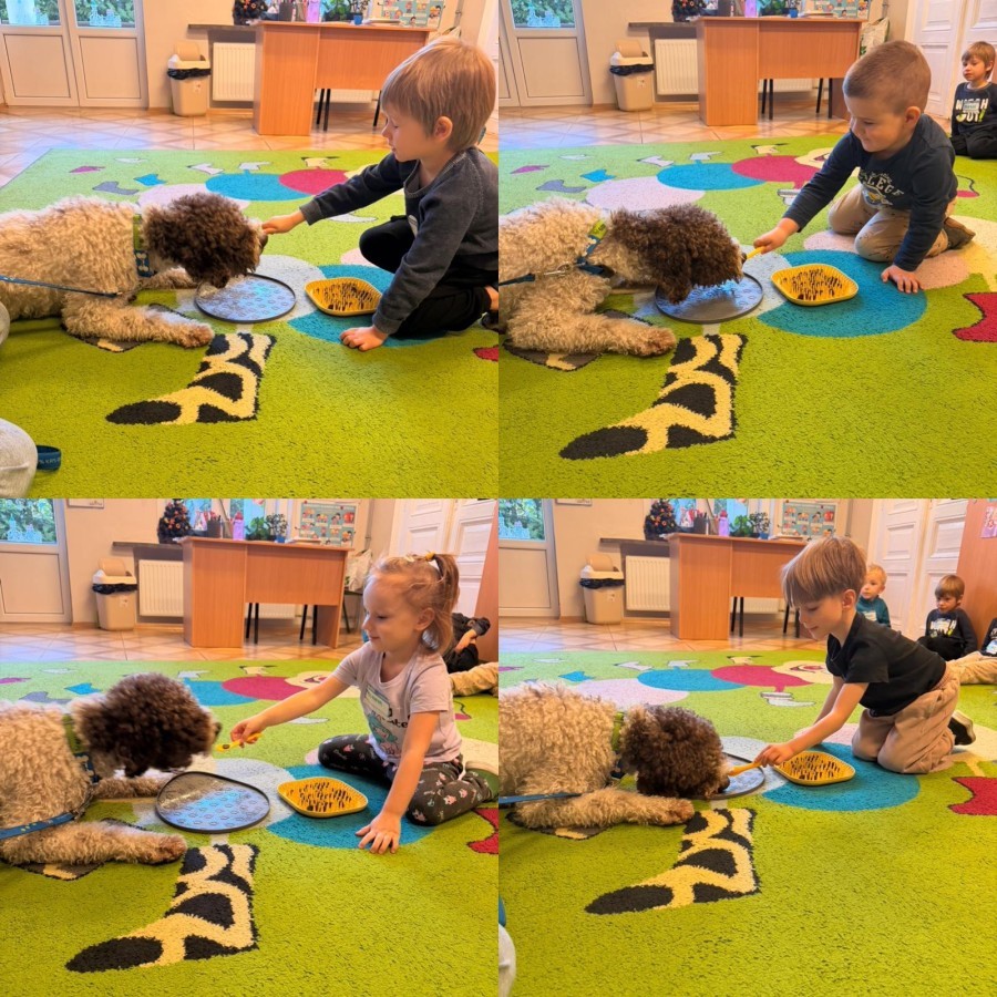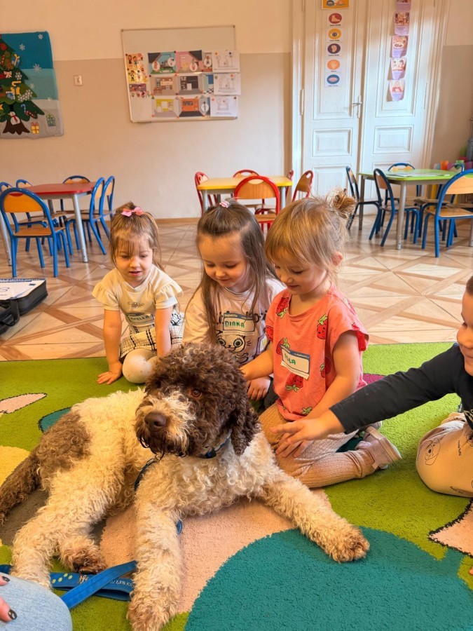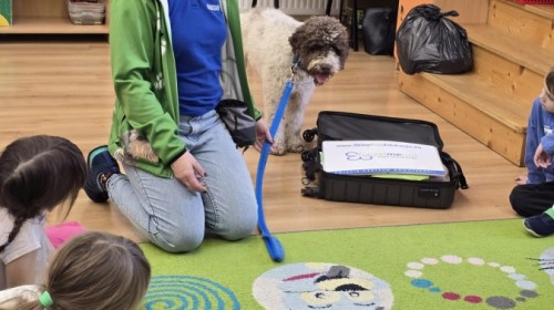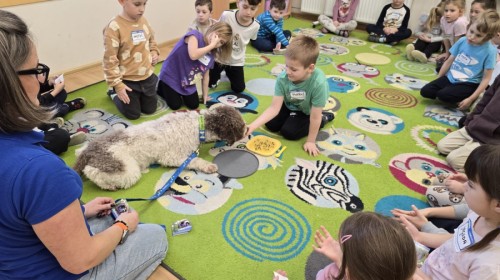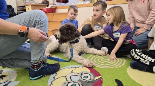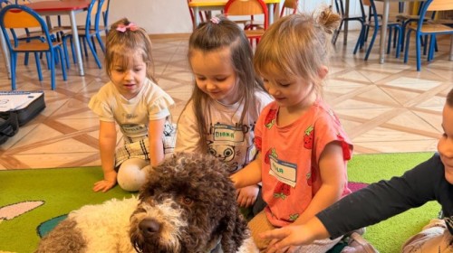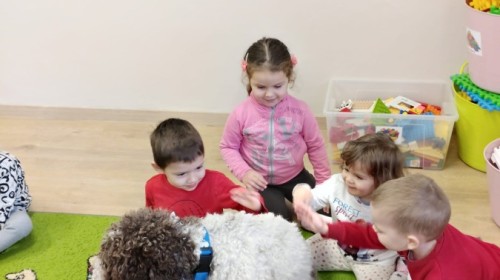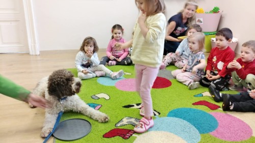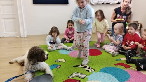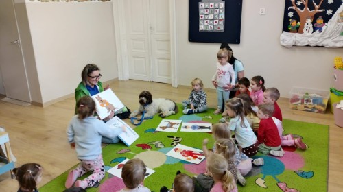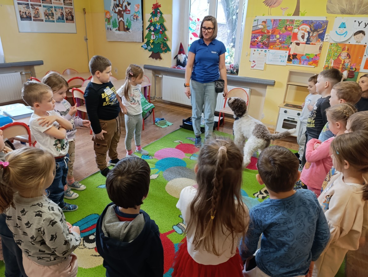 W czwartek, w naszym przedszkolu odbyły się zajęcia z dogoterapii. Była to wyjątkowa forma zajęć, podczas której dzieci miały możliwość bezpośredniego kontaktu z przyjaznym, odpowiednio wyszkolonym psem-terapeutą. Spotkanie było prowadzone przez certyfikowanego dogoterapeutę i odbywało się w bezpiecznej, spokojnej atmosferze, sprzyjającej nauce oraz budowaniu pozytywnych emocji. Podczas zajęć przedszkolaki poznały zasady właściwego zachowania w kontakcie ze zwierzęciem, nauczyły się odczytywać jego sygnały i wiedzą już jak zadbać o jego komfort. Wspólnie z terapeutą uczestniczyły również w różnorodnych aktywnościach: m.in. głaskaniu i karmieniu psa. Zajęcia działały na dzieci uspokajająco i motywująco, pomagały budować poczucie bezpieczeństwa oraz wzmacniały pewność siebie. Wspierały ponadto rozwój emocjonalny, społeczny i ruchowy, uczyły empatii oraz odpowiedzialności i szacunku do zwierząt. Cały dzień minął we wspaniałej, edukacyjnej atmosferze.