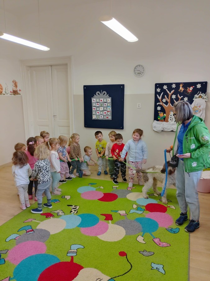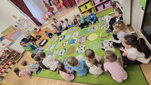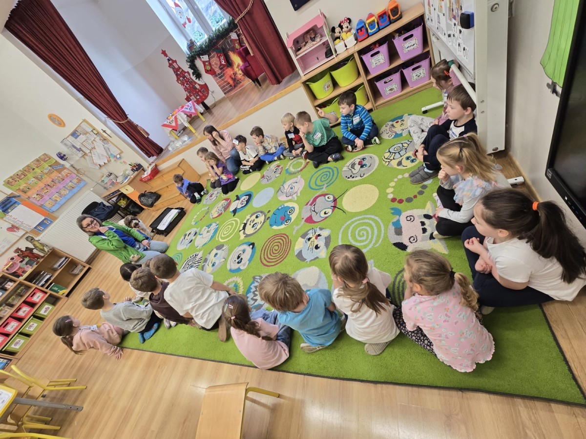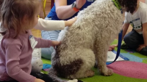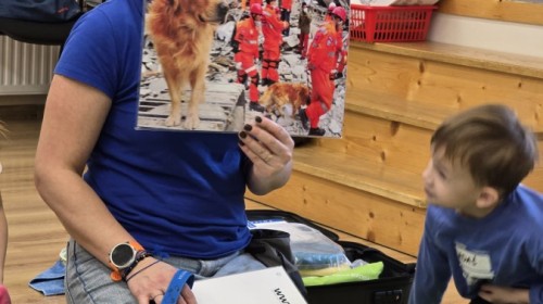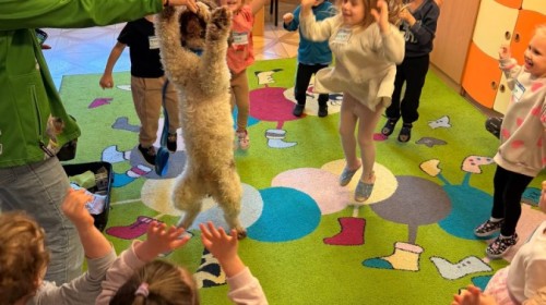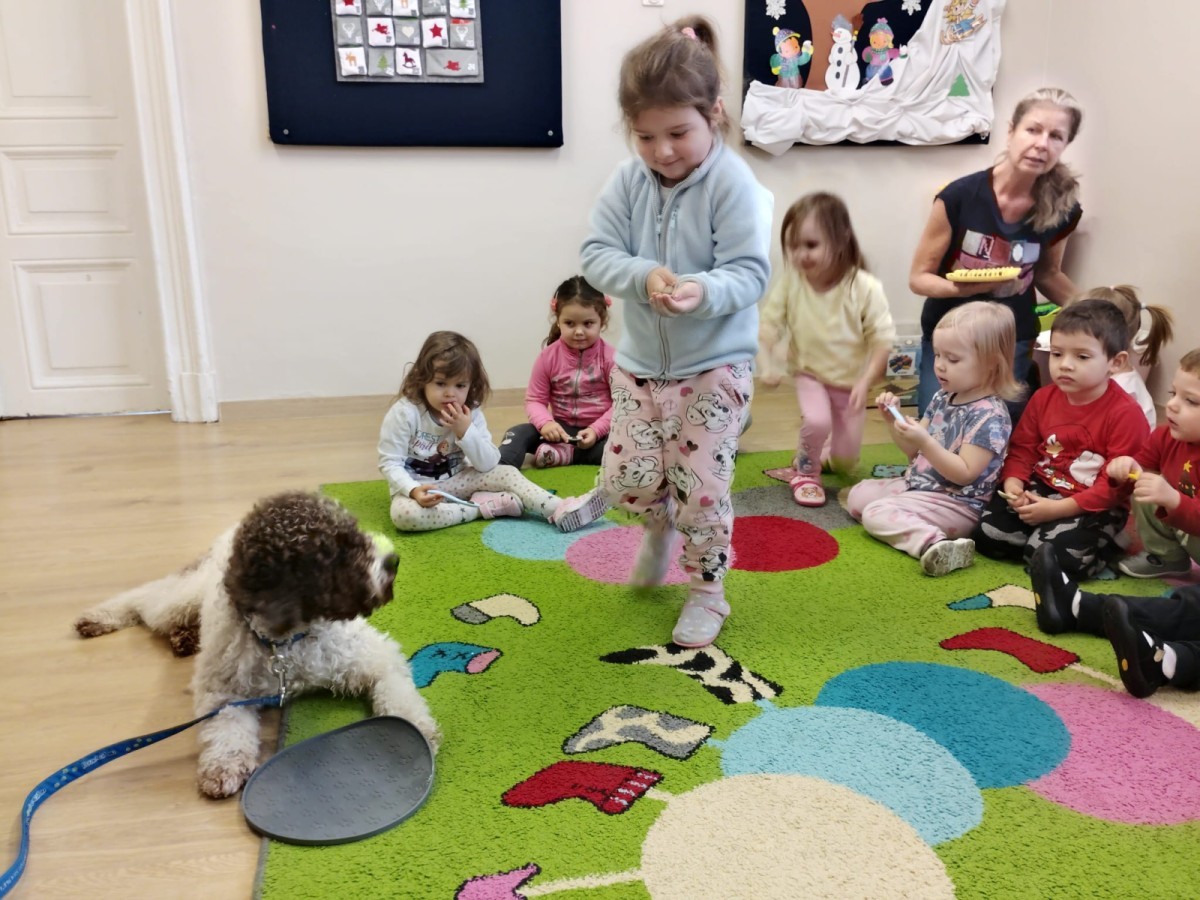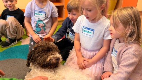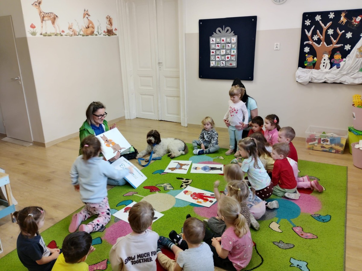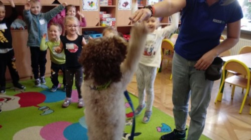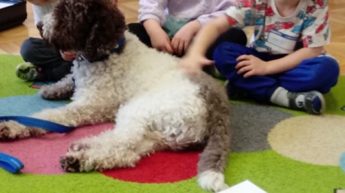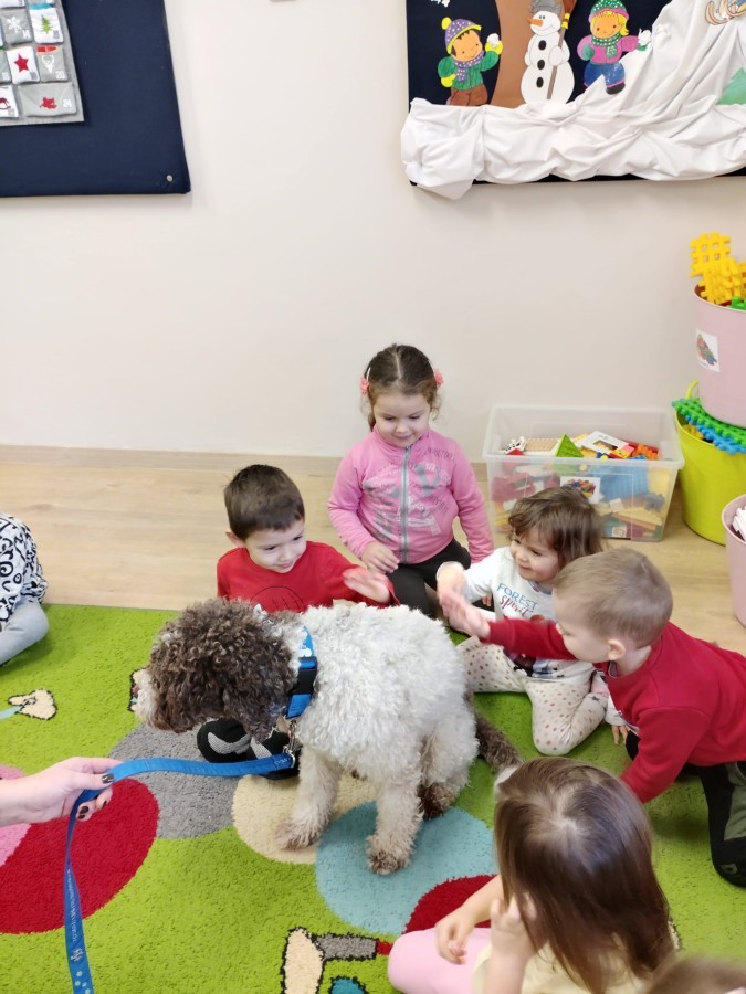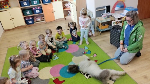 W czwartek, w naszym przedszkolu odbyły się zajęcia z dogoterapii. Była to wyjątkowa forma zajęć, podczas której dzieci miały możliwość bezpośredniego kontaktu z przyjaznym, odpowiednio wyszkolonym psem-terapeutą. Spotkanie było prowadzone przez certyfikowanego dogoterapeutę i odbywało się w bezpiecznej, spokojnej atmosferze, sprzyjającej nauce oraz budowaniu pozytywnych emocji. Podczas zajęć przedszkolaki poznały zasady właściwego zachowania w kontakcie ze zwierzęciem, nauczyły się odczytywać jego sygnały i wiedzą już jak zadbać o jego komfort. Wspólnie z terapeutą uczestniczyły również w różnorodnych aktywnościach: m.in. głaskaniu i karmieniu psa. Zajęcia działały na dzieci uspokajająco i motywująco, pomagały budować poczucie bezpieczeństwa oraz wzmacniały pewność siebie. Wspierały ponadto rozwój emocjonalny, społeczny i ruchowy, uczyły empatii oraz odpowiedzialności i szacunku do zwierząt. Cały dzień minął we wspaniałej, edukacyjnej atmosferze.