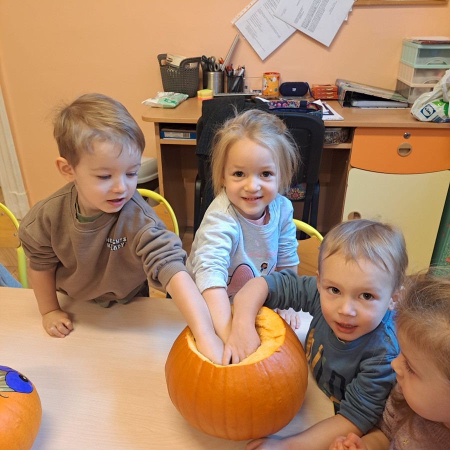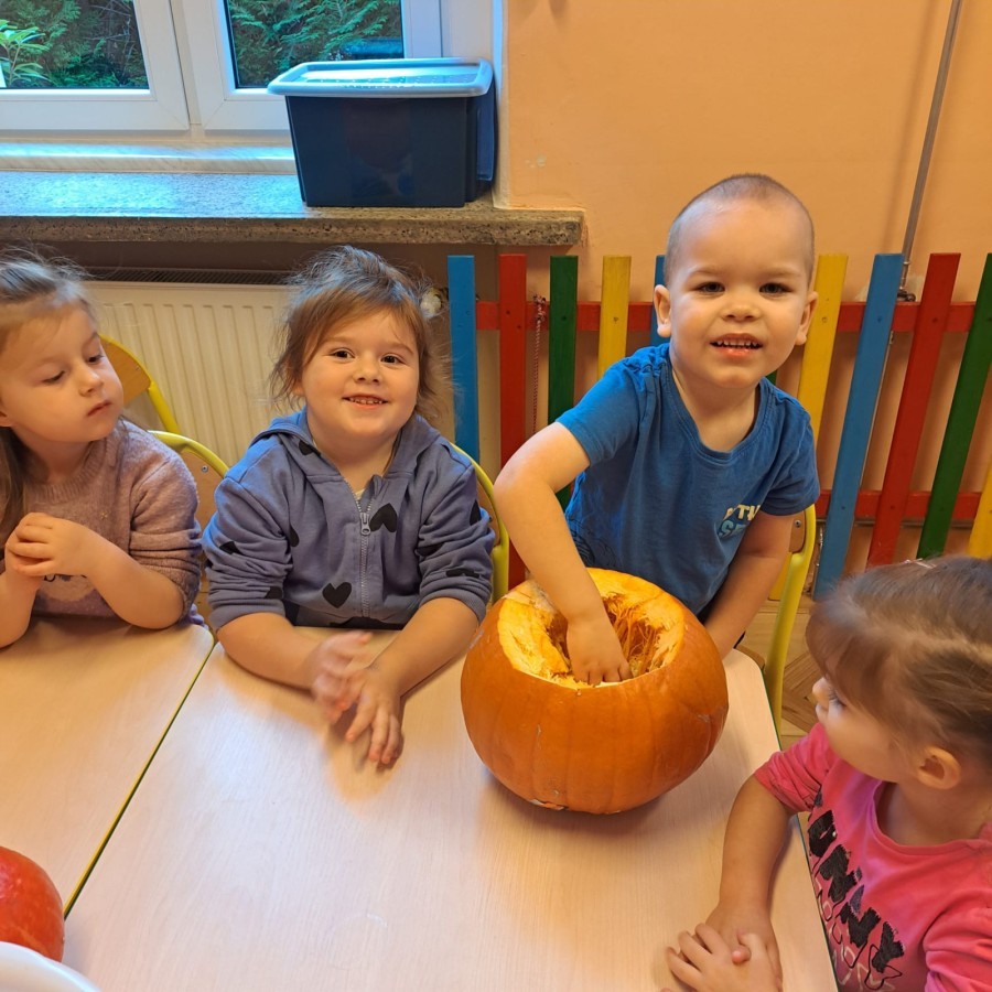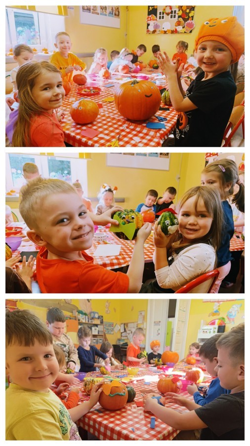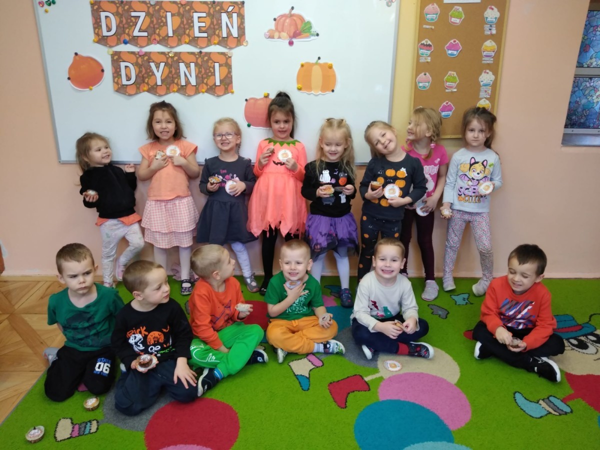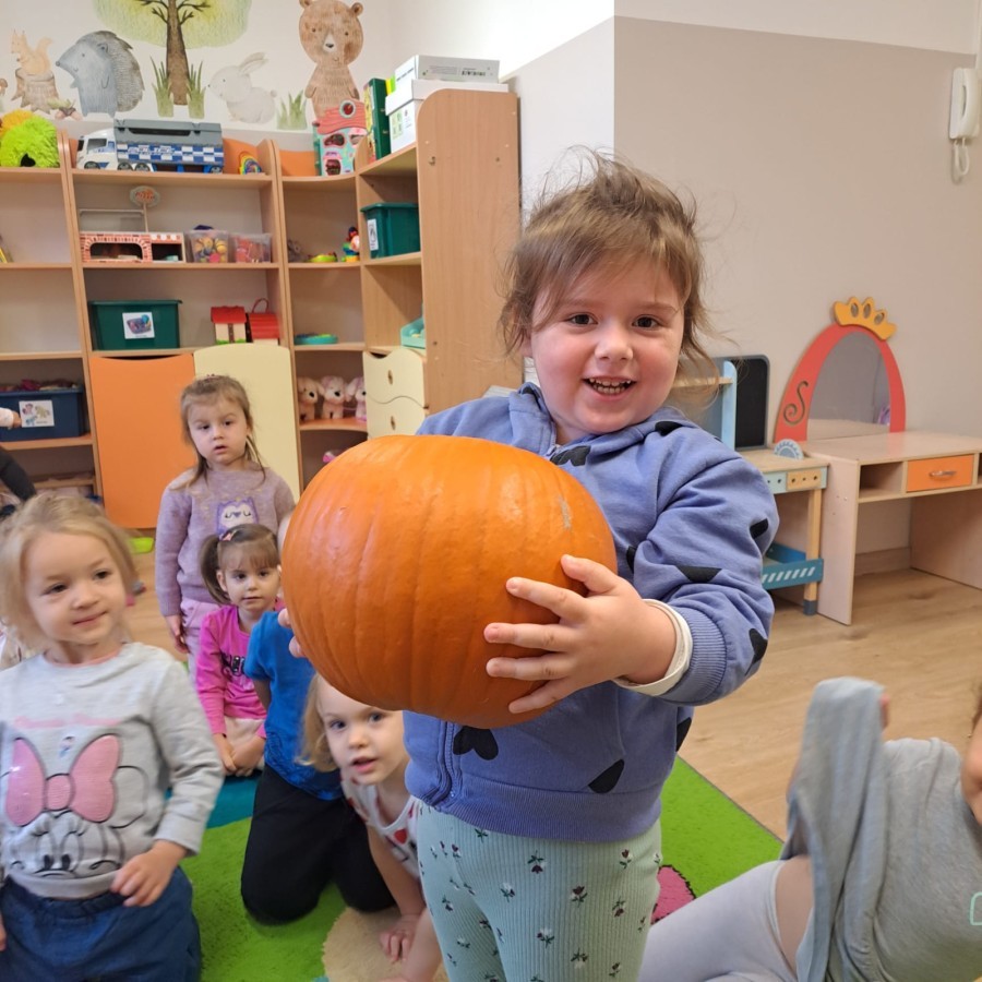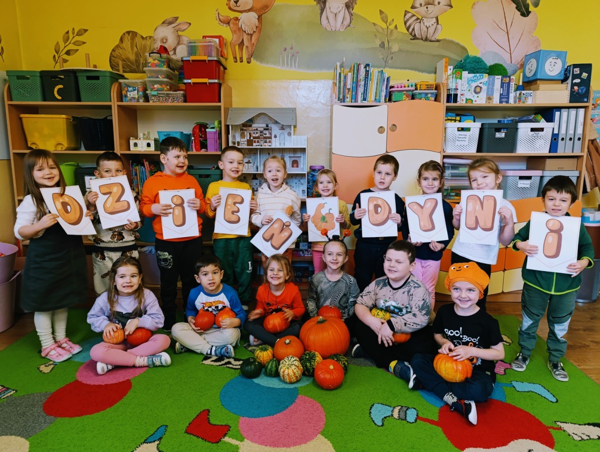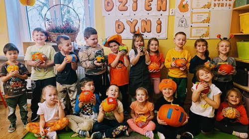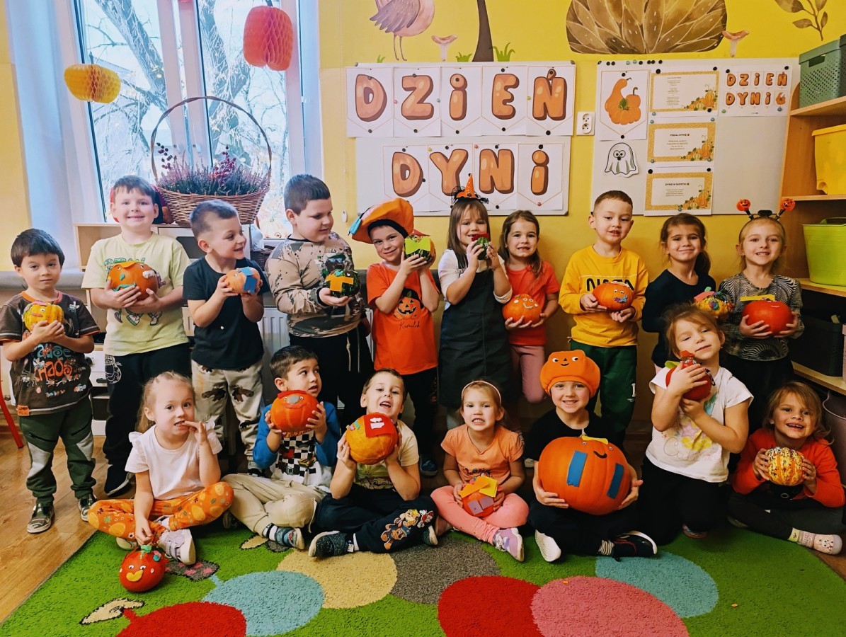 Pod koniec października w naszym przedszkolu zrobiło się wyjątkowo pomarańczowo i radośnie! Obchodziliśmy Dzień Dyni – święto, które na stałe wpisało się w kalendarz naszych wydarzeń. Tego dnia przedszkolne sale zamieniły się w prawdziwe dyniowe królestwo. Przedszkolaki poznały różne odmiany dyni, ich kolory, kształty i zastosowanie – nie tylko w kuchni! Nie zabrakło wesołych zabaw ruchowych, konkursów, pieczenia przepysznych ciast i babeczek oraz tworzenia kreatywnych prac plastycznych z wykorzystaniem dyni. Pomysłowość i zaangażowanie dzieci przerosło nasze oczekiwania! Dzień Dyni był pełen radości, kreatywności i dyniowych niespodzianek.