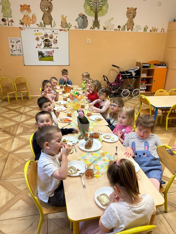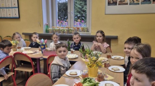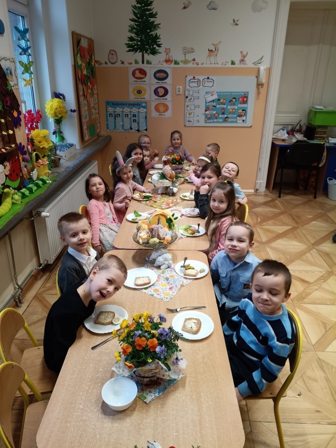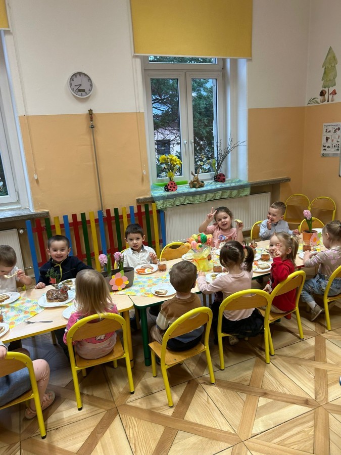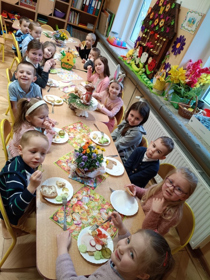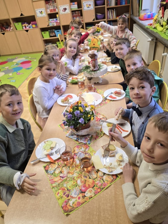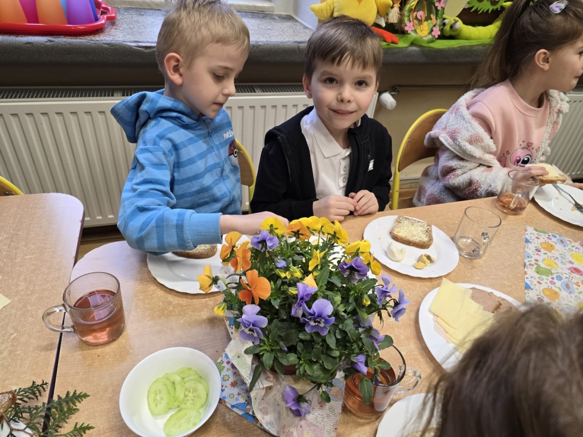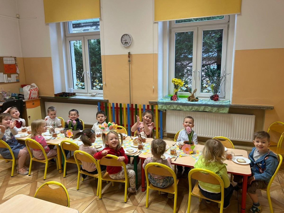 W piątek w naszym przedszkolu odbyło się uroczyste Śniadanie Wielkanocne. Dzieci zasiadły przy pięknie udekorowanych stołach, na których nie zabrakło tradycyjnych wielkanocnych potraw, kolorowych pisanek oraz wiosennych ozdób. Dzień wcześniej każda grupa przygotowywała wielkanocnego baranka, zajączka i kurkę– wielkanocne wypieki dzieci wykonały razem z naszą kochaną panią Agatką. Podczas śniadania dzieci miały okazję wspólnie spędzić czas, porozmawiać o tradycjach wielkanocnych oraz skosztować przygotowanych przysmaków. Po śniadaniu były poszukiwania wielkanocnego zajączka, który zostawił dla wszystkich piękne upominki:) Było dużo śmiechu, radości i pozytywnych emocji:)