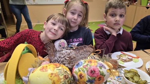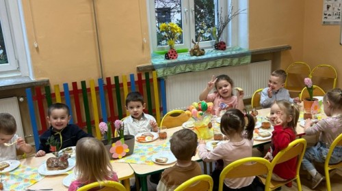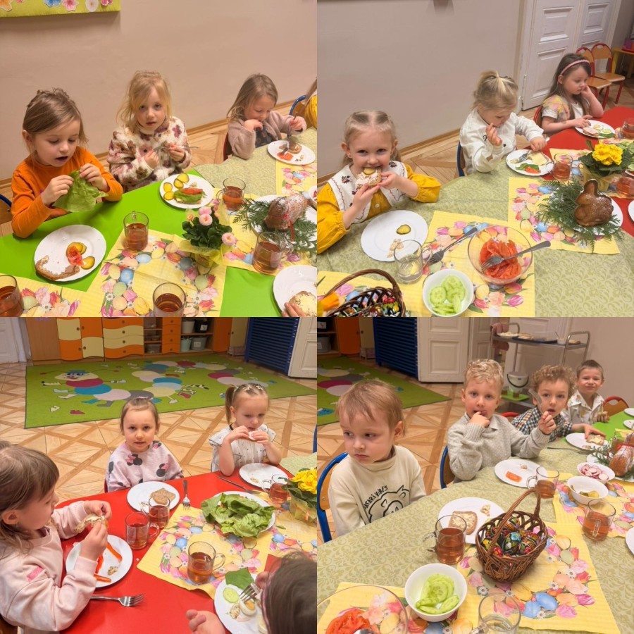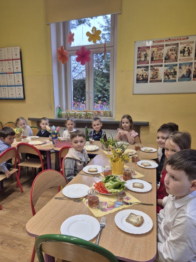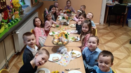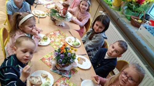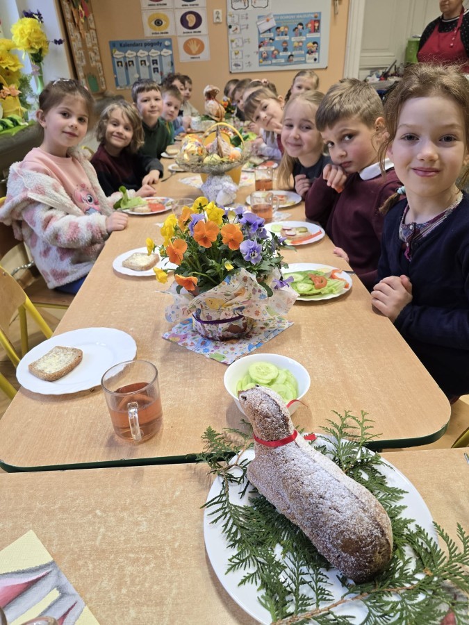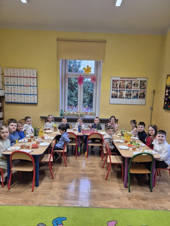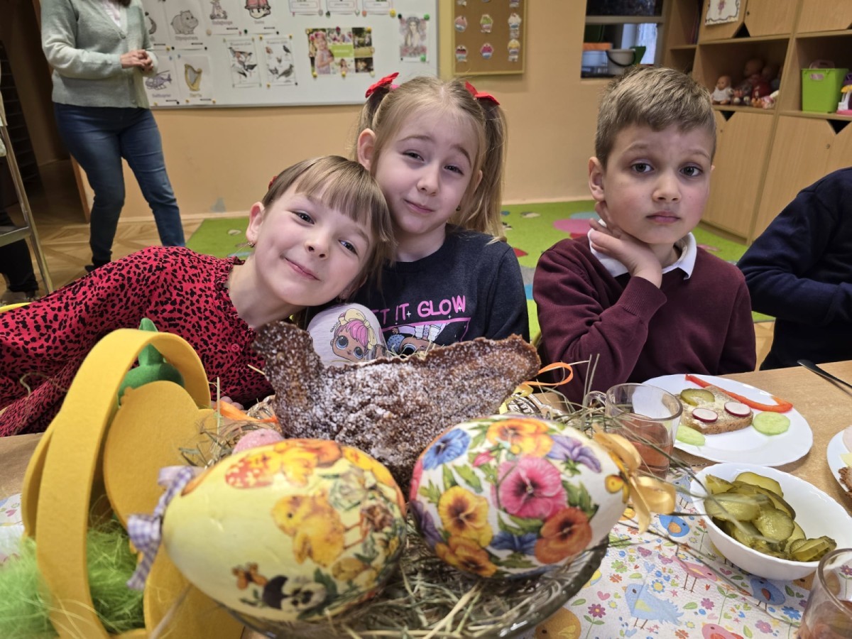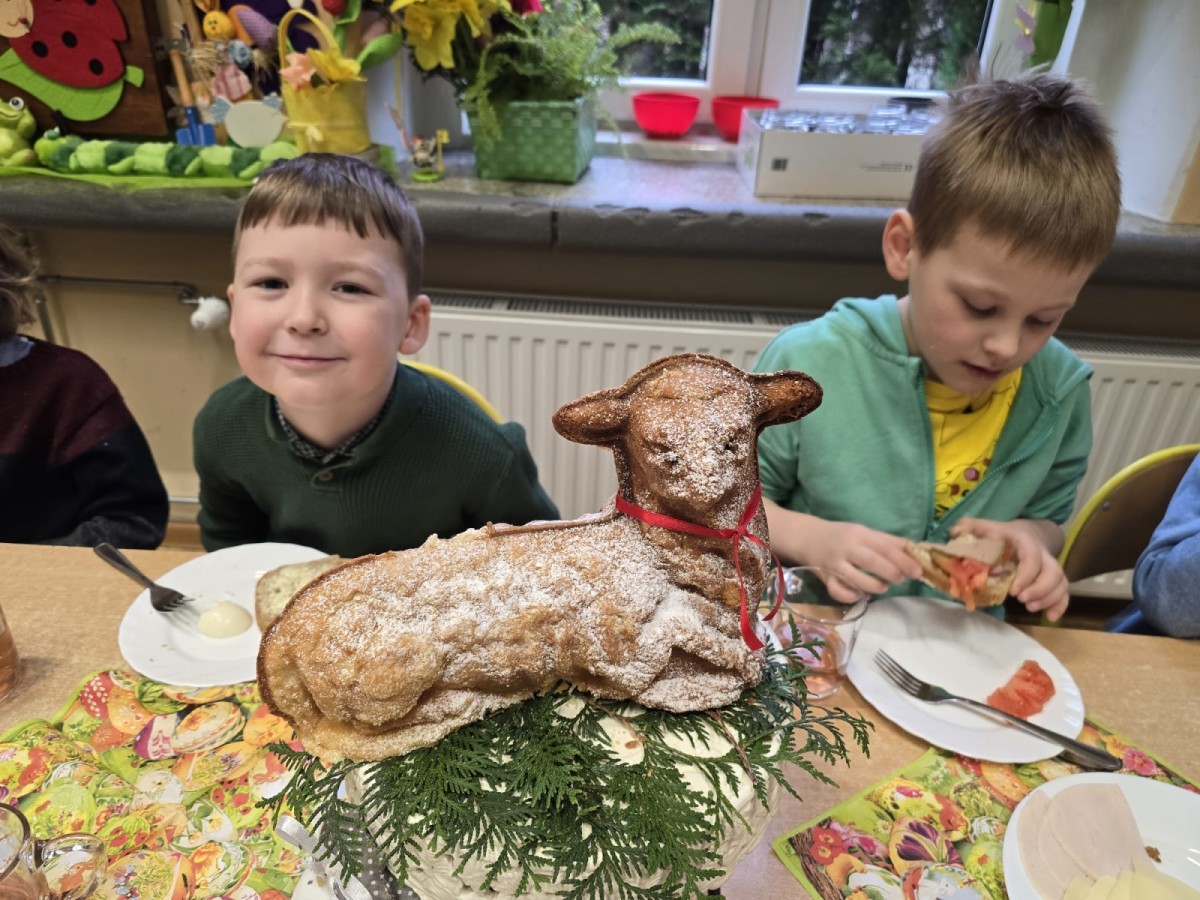 W piątek w naszym przedszkolu odbyło się uroczyste Śniadanie Wielkanocne. Dzieci zasiadły przy pięknie udekorowanych stołach, na których nie zabrakło tradycyjnych wielkanocnych potraw, kolorowych pisanek oraz wiosennych ozdób. Dzień wcześniej każda grupa przygotowywała wielkanocnego baranka, zajączka i kurkę– wielkanocne wypieki dzieci wykonały razem z naszą kochaną panią Agatką. Podczas śniadania dzieci miały okazję wspólnie spędzić czas, porozmawiać o tradycjach wielkanocnych oraz skosztować przygotowanych przysmaków. Po śniadaniu były poszukiwania wielkanocnego zajączka, który zostawił dla wszystkich piękne upominki:) Było dużo śmiechu, radości i pozytywnych emocji:)