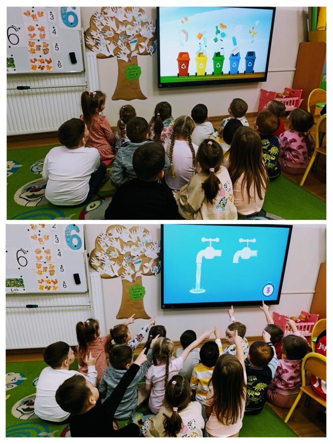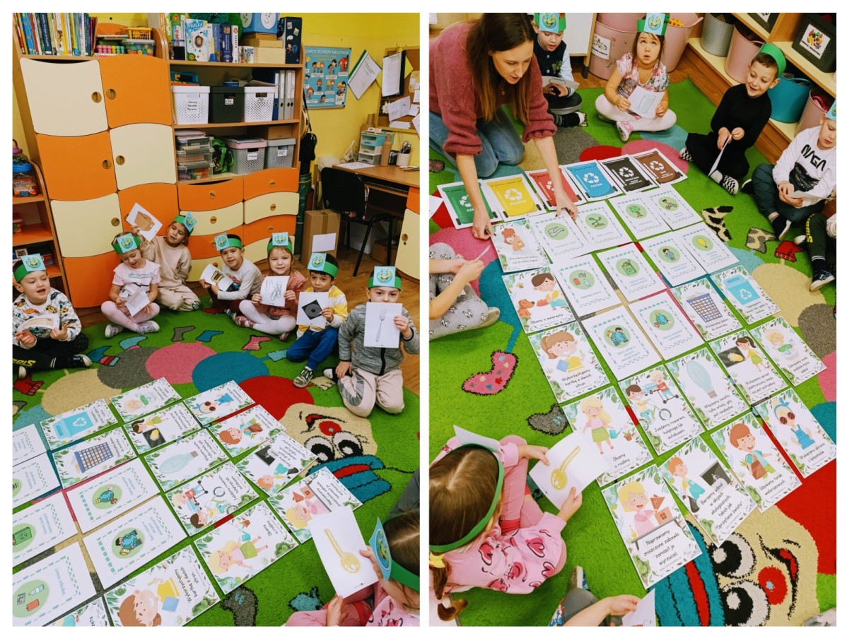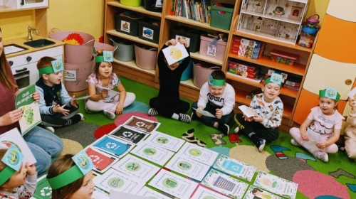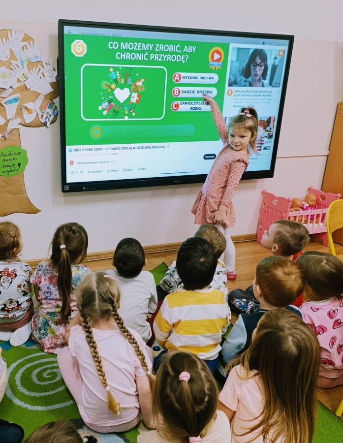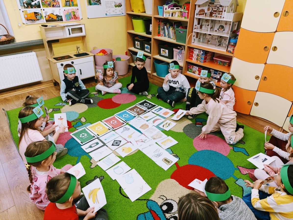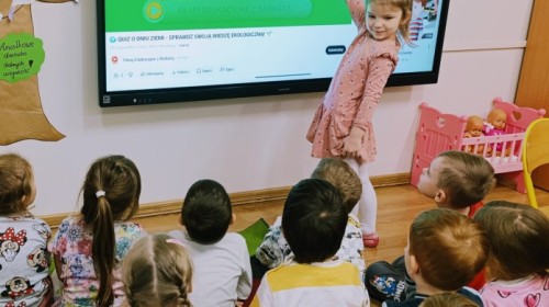 Działania edukacyjne w ramach realizacji 16 edycji konkursu "Szanuj energię, chroń klimat". Udział przedszkolaków z grupy "Krasnoludków" w: "stworzonym przez nauczyciela quizie ekologicznym na temat ochrony środowiska i klimatu, energii odnawialnej, poszanowania wody, gospodarki odpadami, gospodarki cyrkularnej, eko-transportu i elektromobilności".