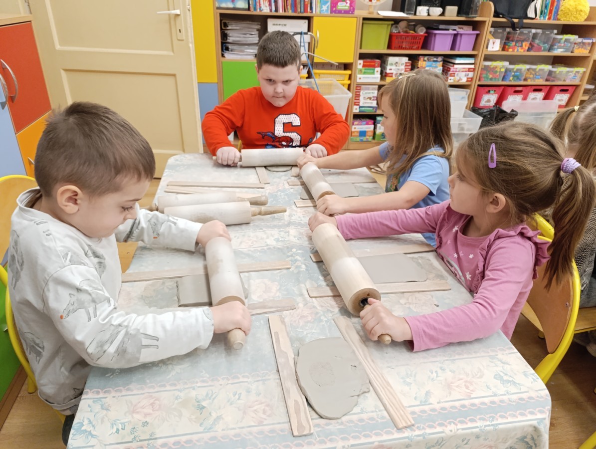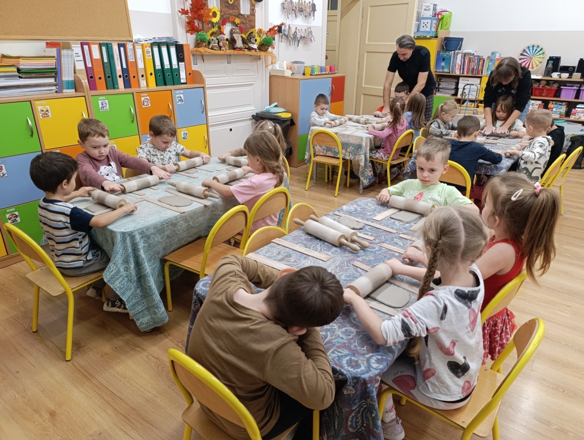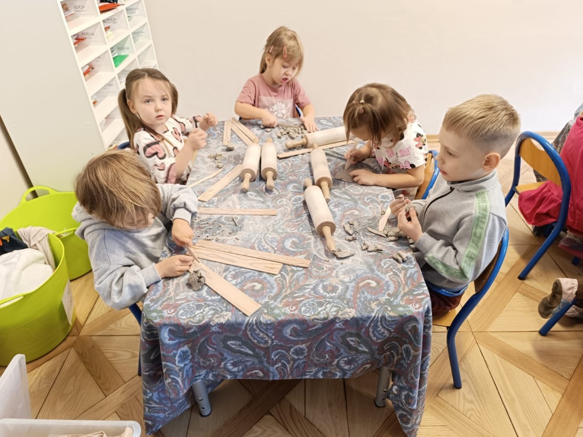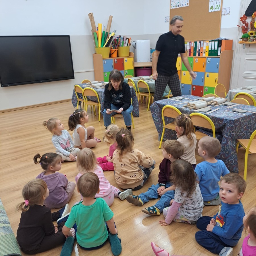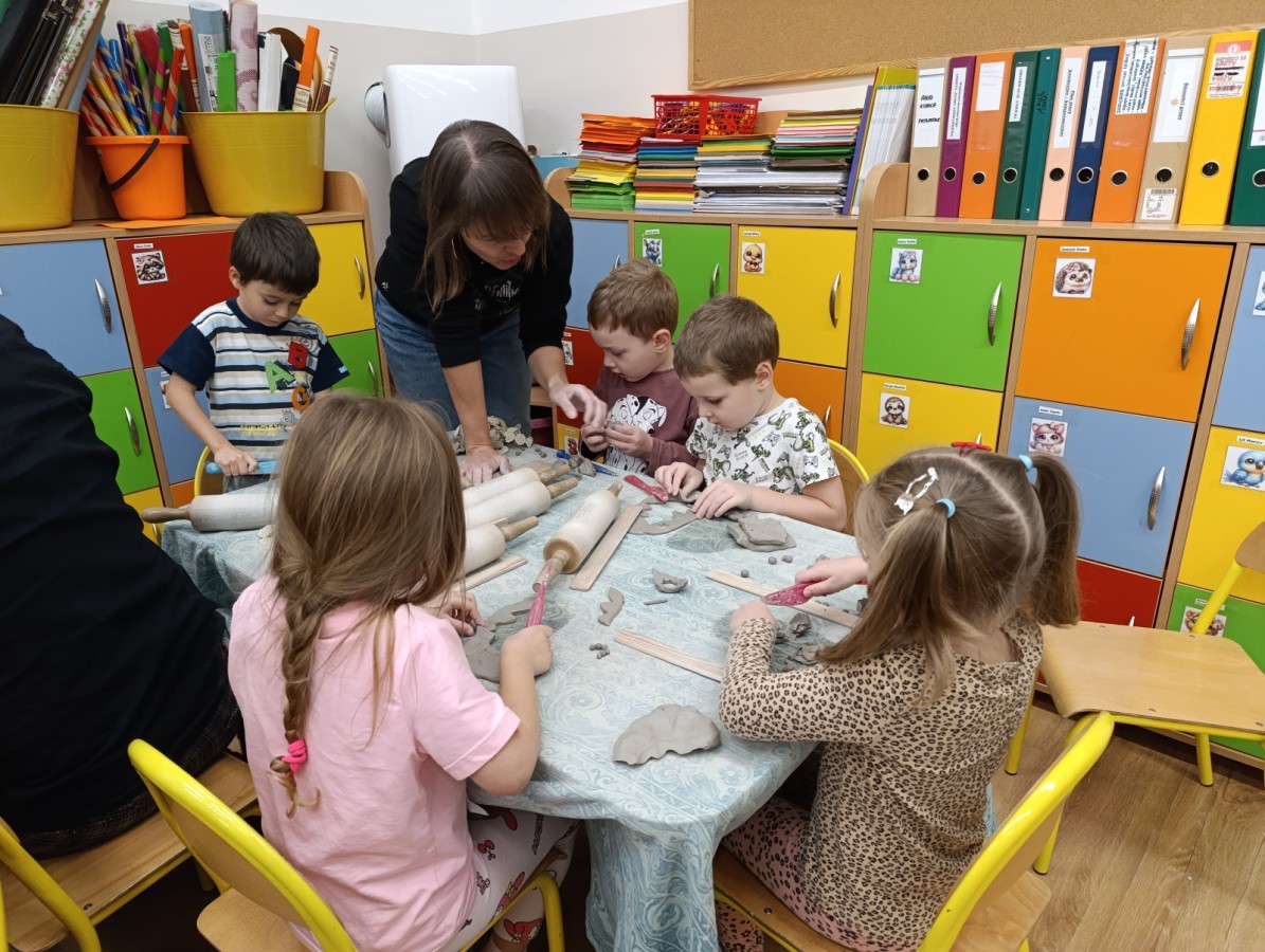 27 i 28 października odbyły się w naszym Przedszkolu wyjątkowe warsztaty ceramiczne, podczas których dzieci mogły odkryć w sobie prawdziwych artystów! Zajęcia poprowadzili wspaniali instruktorzy, którzy w ciekawy, relaksacyjny sposób wprowadzili przedszkolaki w świat gliny. Dzieci z wielkim zaangażowaniem ugniatały, wałkowały i lepiły glinę, rozwijając przy tym sprawność manualną, wyobraźnię i cierpliwość. Po zakończeniu lepienia prace zostały odłożone do wyschnięcia. Zostaną później wypalone w piecu ceramicznym, a następnie ozdobione i pomalowane przez dzieci. Warsztaty sprawiły przedszkolakom ogromną radość — towarzyszył im uśmiech, ciekawość i duma z własnoręcznie wykonanych prac. Była to doskonała okazja do rozwijania kreatywności i wrażliwości artystycznej.
