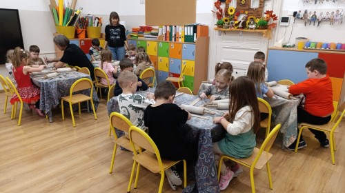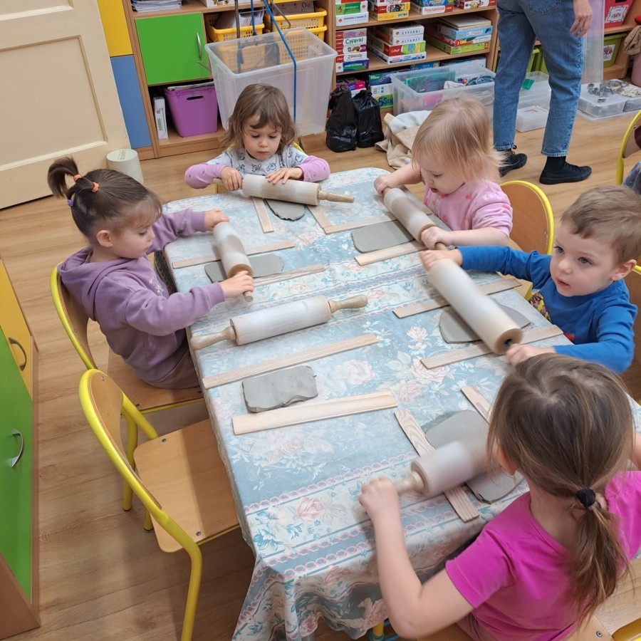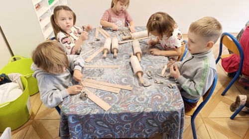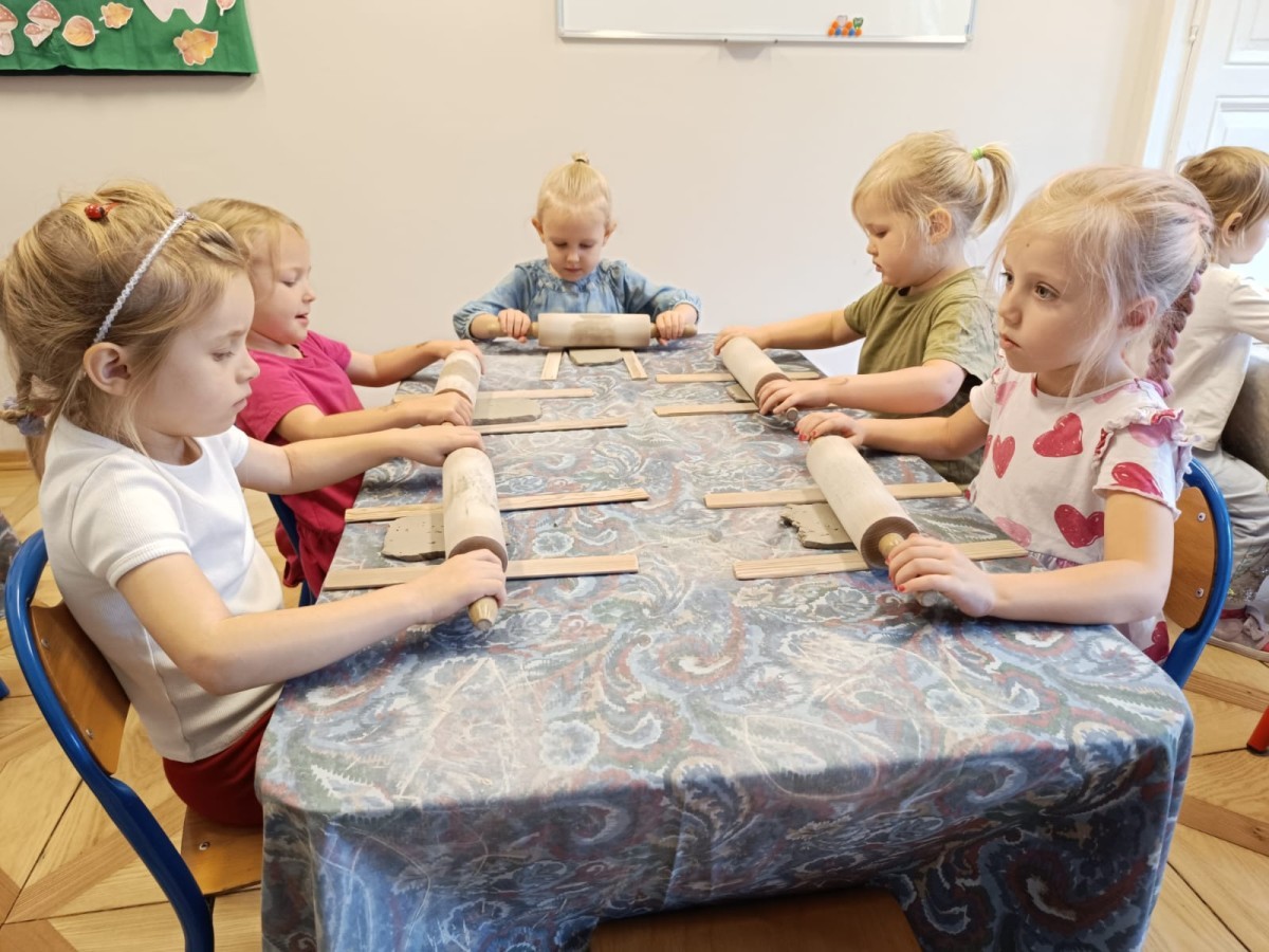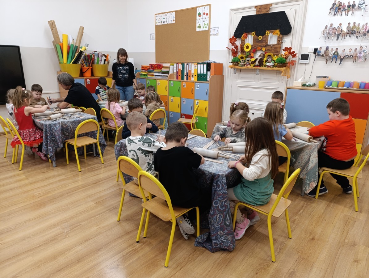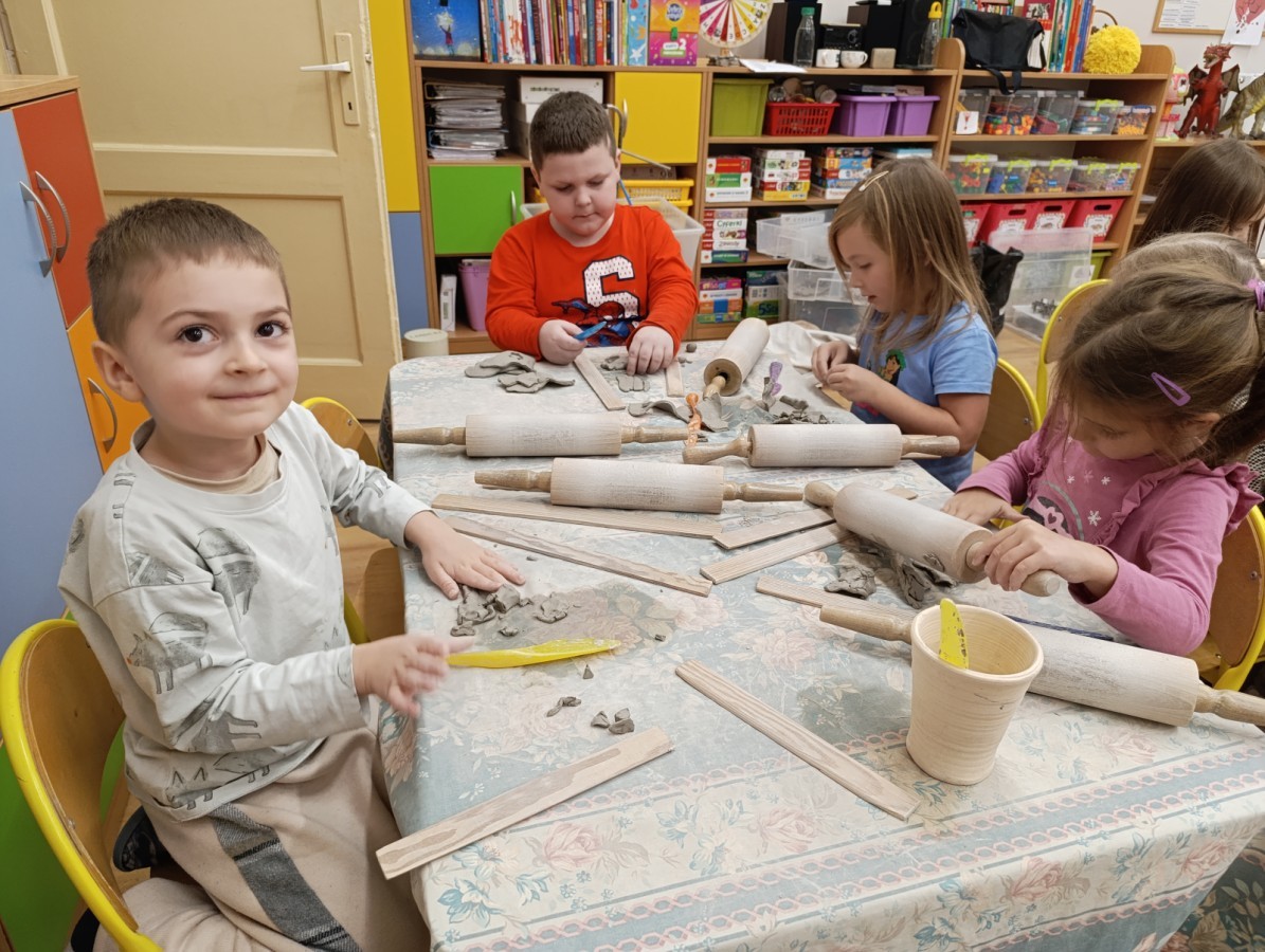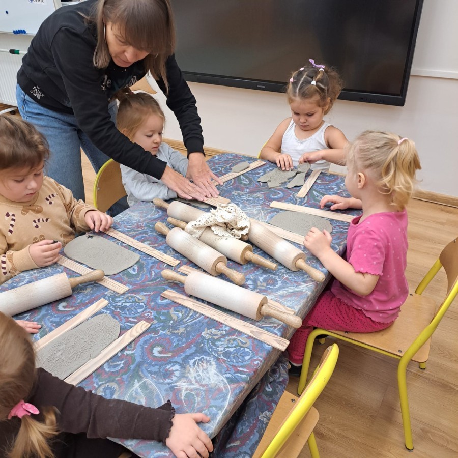 27 i 28 października odbyły się w naszym Przedszkolu wyjątkowe warsztaty ceramiczne, podczas których dzieci mogły odkryć w sobie prawdziwych artystów! Zajęcia poprowadzili wspaniali instruktorzy, którzy w ciekawy, relaksacyjny sposób wprowadzili przedszkolaki w świat gliny. Dzieci z wielkim zaangażowaniem ugniatały, wałkowały i lepiły glinę, rozwijając przy tym sprawność manualną, wyobraźnię i cierpliwość. Po zakończeniu lepienia prace zostały odłożone do wyschnięcia. Zostaną później wypalone w piecu ceramicznym, a następnie ozdobione i pomalowane przez dzieci. Warsztaty sprawiły przedszkolakom ogromną radość — towarzyszył im uśmiech, ciekawość i duma z własnoręcznie wykonanych prac. Była to doskonała okazja do rozwijania kreatywności i wrażliwości artystycznej.