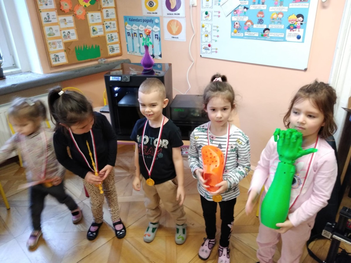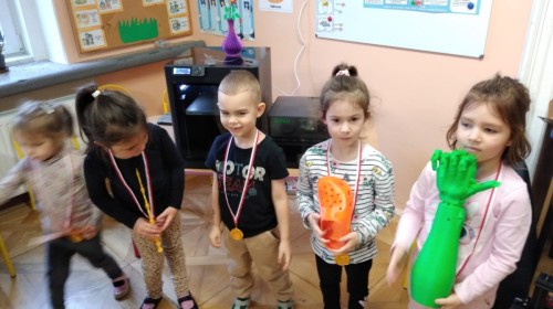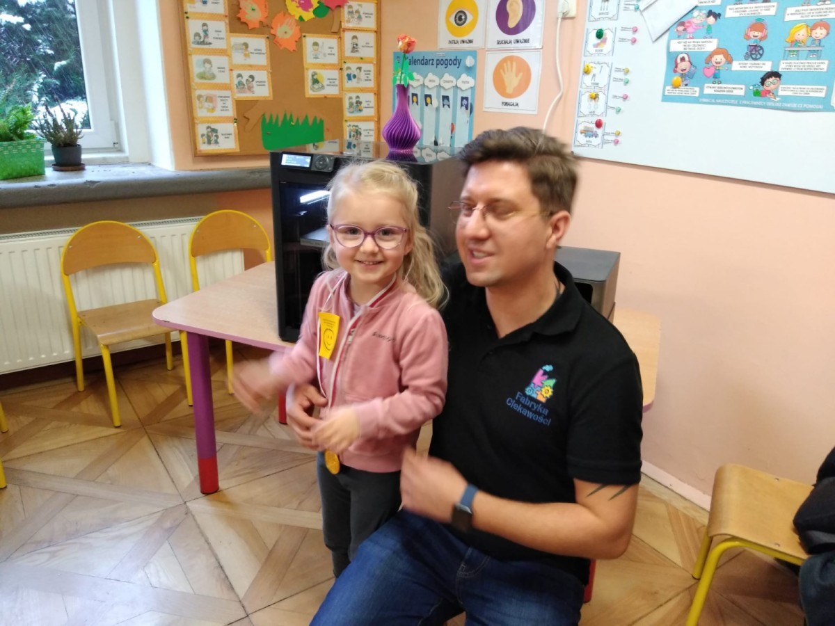 W piątek, w naszym przedszkolu, odbyła się wyjątkowa wizyta – tata Natalki z grupy Tygrysków, przeprowadził dla dzieci fascynujące zajęcia z drukarką 3D. Przedszkolaki mogły z bliska zobaczyć, jak działa urządzenie oraz jak z warstwa po warstwie powstają trójwymiarowe przedmioty. Dzieci dowiedziały się, do czego można wykorzystać druk 3D i oglądały przykładowe wydruki przyniesione przez naszego gościa. Największe zainteresowanie wzbudził sam moment drukowania, podczas którego każdy mógł obserwować, jak kształt powoli nabiera formy. Zajęcia były pełne ciekawostek, pytań i zachwytów. Przedszkolaki podziękowały tacie Natalki za wspólne, inspirujące spotkanie:)